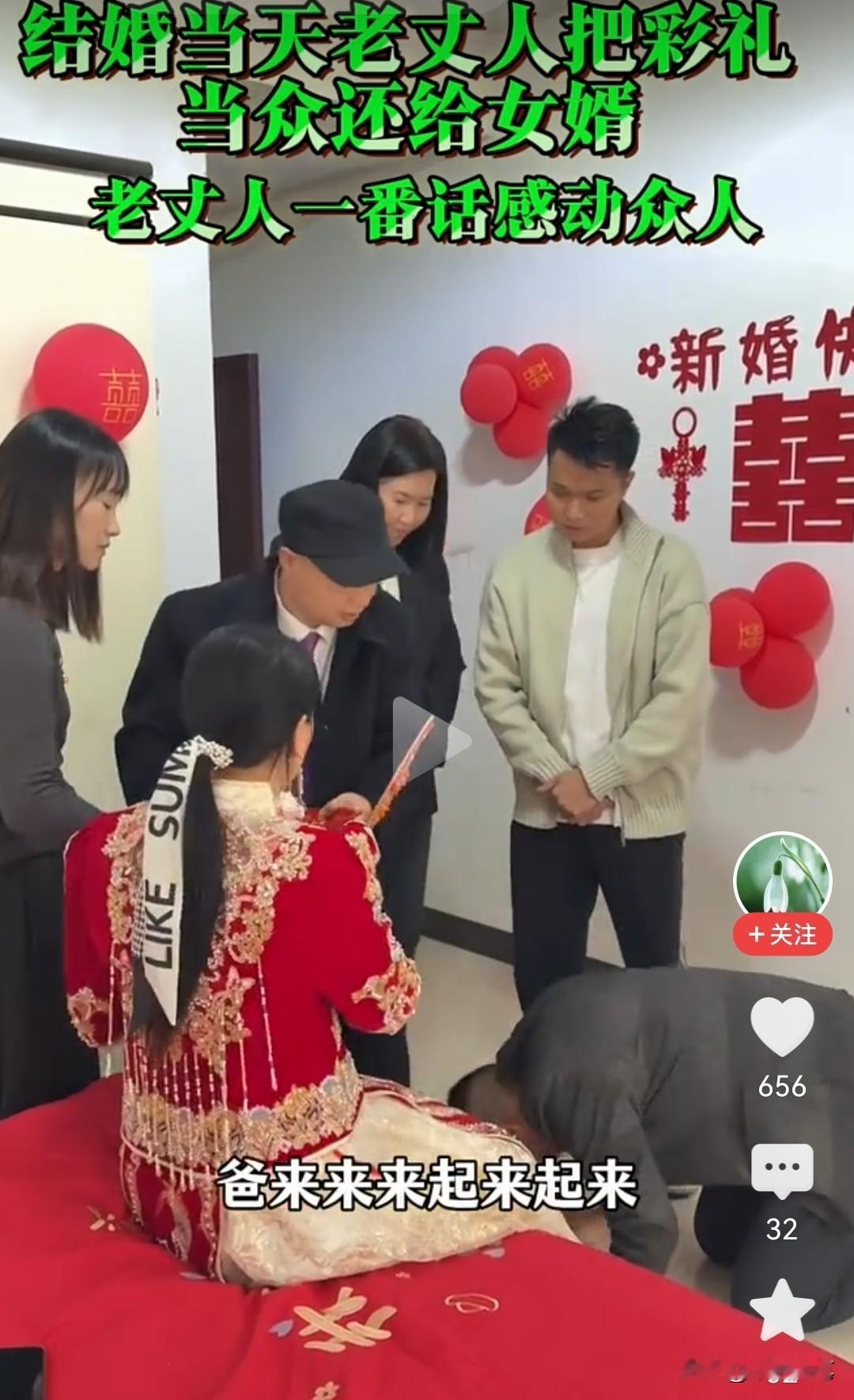老丈人的一番话,让女婿立刻跪下来嗑了三个响头,这场景太震撼了,让人泪目。 婚礼现场,女婿捧着20万彩礼的盘子正准备交给新娘子,就被老丈人一把拦住了。 老丈人说:“小唐,这个彩礼仅仅是一个考验。这钱是借来的吧?我知道你家也不容易,我家是嫁女儿,不是卖女几,万里挑一,留一张100元意思一下就行了,你把钱拿回去,把钱还完,我们开开心过就好。我女儿嫁过去,以后你对她好就行了。 女婿听了老丈人的话,刚开始一下子愣住了。之后用手抹了一下眼泪,立刻跪了下去给老丈人嗑了三个响头。 看看,这才是相亲相爱一家人。老丈人的体谅,女儿的大度以及女婿的情感反映,描绘了一幅婚礼之中别开生面的温情画面。
