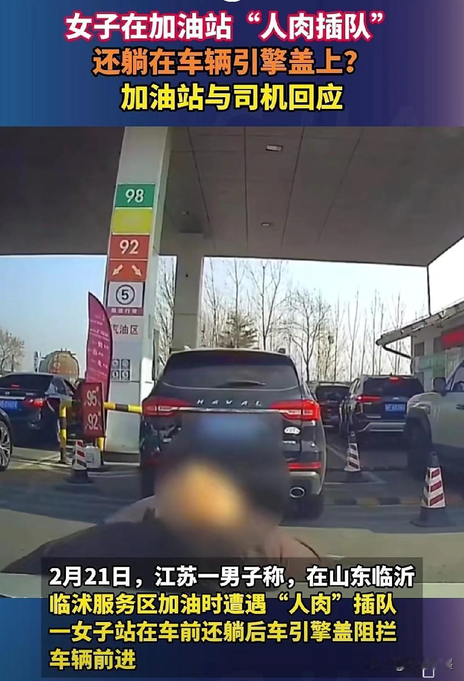 见过人肉插队并道的,人肉占车位的,人肉插队买票的,没见过人肉插队加油的! 近日,在山东临沂一加油站内,一名女子为了让自家车尽快加油,突然跑到正在排队的一辆车前,躺在了汽车引擎盖上,被挡车辆司机哭笑不得,表示没见过这样的,很无语! 男子又气又笑,按了几声喇叭想要让女子离开,但女子选择听不见,等到自己家里车过去才下来,下来的时候嘴里振振有词,不知道在说什么! 幸亏这位男司机脾气好,全程没有下车,要是碰到那些脾气大的人,非得下去跟女子理论一下不可,说不定还会强行把她拖走,毕竟女子不占理!