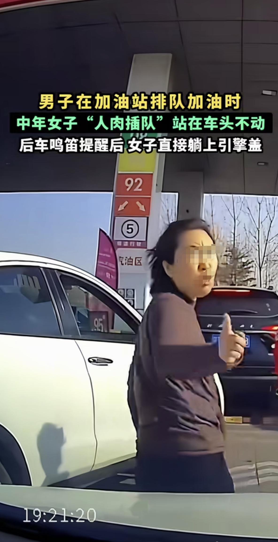 这不该报警吗?男子在加油站排队加油时,一中年女子挡在了他的车前“人肉插队”。男子鸣笛示意女子让开,她不但不让,反而直接躺在了引擎盖上不动了,直到她同行的车插队成功才起身。 有网友发视频爆料,2月20日,在某地的一个加油站入口处发生了上述令人气愤的一幕。 那位中年女子等她同行的车插队成功了不紧不慢地站直了,还对后面的车司机指指点点,嘴里说着什么,上了副驾位置进去加油了。 要说急,有几个不急呢! 但守规矩的人都在排队。 如果她确实有特殊情况需要更早一点进去加油,可以和别人说清楚,让一下她也不是不行,但她不应该直接上这一招儿啊! 不少网友觉得,为什么后面这辆车司机不报警说她碰瓷? 其实算下来,她这耍赖的行为也就耽误了人家一两分钟时间,不愿意和她计较罢了。 以她这样的性格,以后遇到类似的情况很可能还会重复当天的操作,但下次她就不一定有这么好的运气了。
