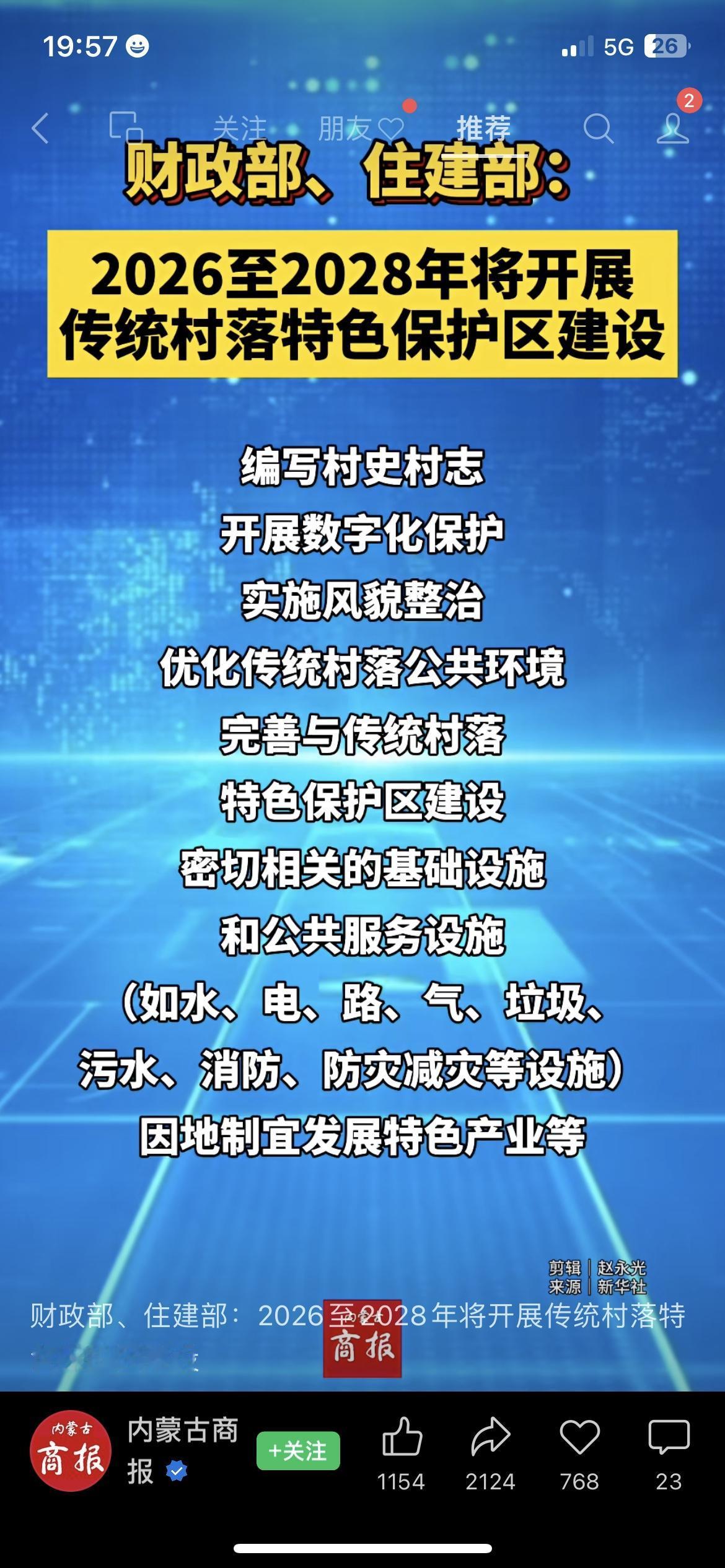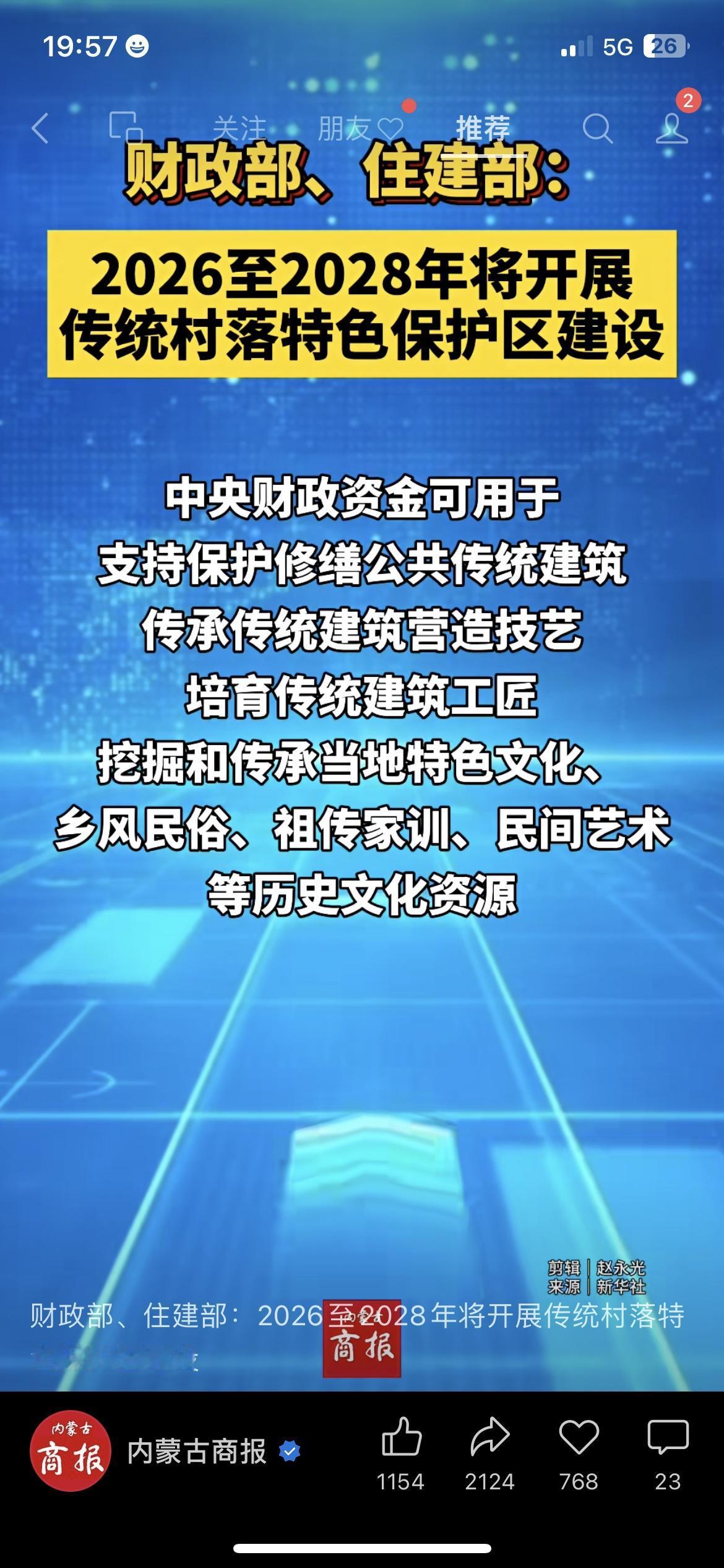 5000万/县!2026-2028年,传统村落要火了! 今天看到财政部、住建部的通知,中央财政给每个入选县补助5000万,分两年下达,用于传统村落特色保护区建设。我妈看到这个消息,第一时间给我打电话:“咱老家那个老祠堂,是不是也能申请点钱修修?” 说白了,这5000万不是“救济款”,是“启动资金”。它要干的事,不只是修房子,更是要让传统村落“活”起来: • 编写村史村志,留住乡愁记忆 • 开展数字化保护,让老建筑“上云” • 实施风貌整治,优化公共环境 • 因地制宜发展特色产业,比如文旅、非遗、民宿 对咱普通人来说,这既是机会,也是责任。机会是,传统村落的文旅、文创、民宿等产业,会迎来一波爆发;责任是,我们要守住老祖宗留下的根,不能让商业化毁了乡愁。 信息来源:财政部、住建部官方通知。 传统村落 乡村振兴 文旅 民生政策 5000万补助特色农文旅规划