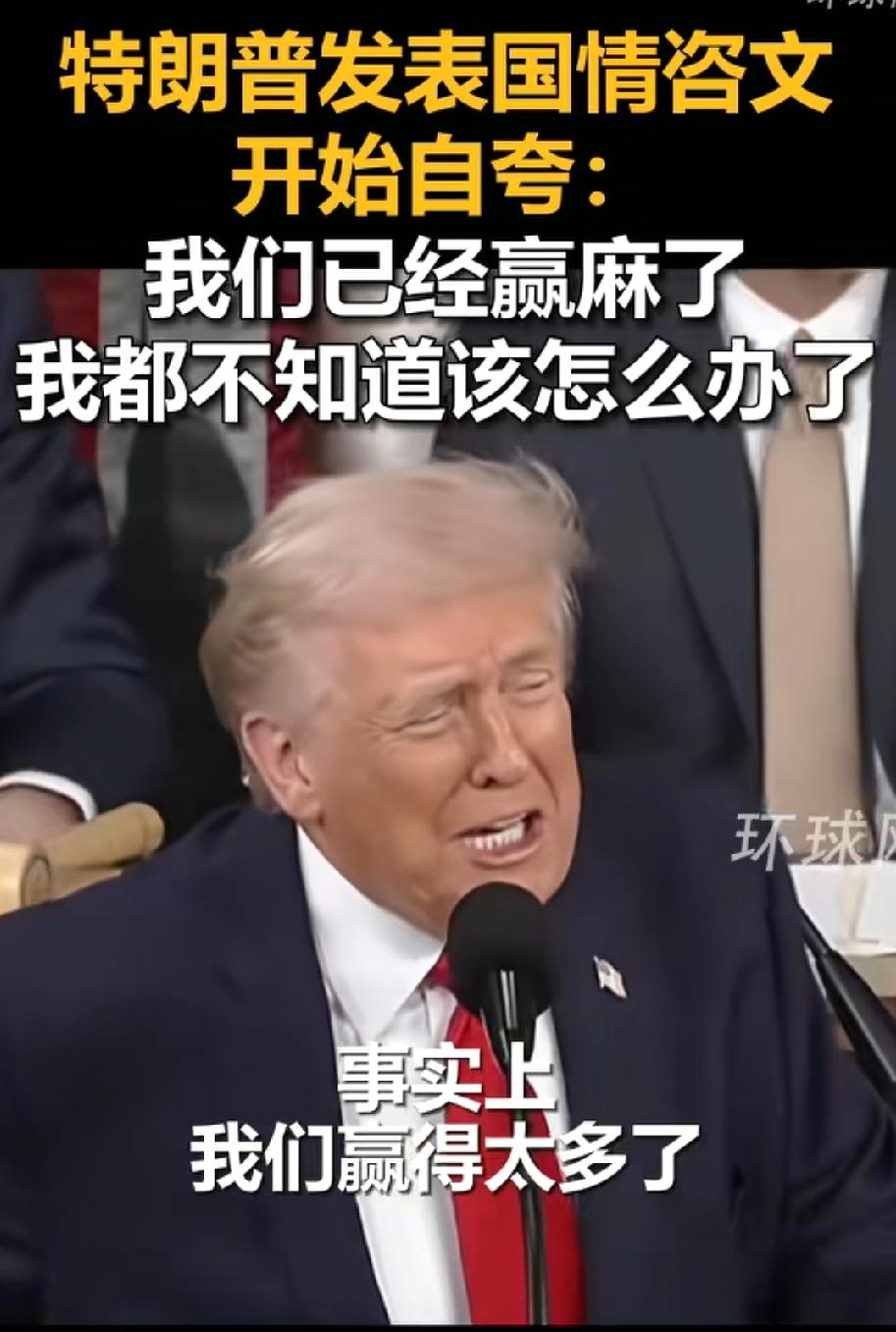大吹特吹,特朗普发表国情咨文变赢麻学吹捧现场! 咱先看看特朗普先生去年一年做了多少实事儿,年初全球加关税加敲诈勒索,欧盟宰了一票日韩宰了一票,到东大这里碰到硬茬子了,啃了几个月,牙都崩掉了,愣是让东大成为了首个万亿贸易国家,他特朗普哪里是在堵东大,分明成了送财童子了! 一圈下来看似轰轰烈烈,实则是忙活了一年被美国最高法院给判了违法,合着折腾一年,最后还是镜中花水中月! 再说委内瑞拉绑架马杜罗事件,做的很漂亮,不得不说,美国下手还是一如既往的稳准狠,但抓了马杜罗实际上并没有任何卵用! 筹备了半年多,打也不敢打,就那么对峙着,最后绑票了总统还真算是虎头蛇尾,因为啥?因为委内瑞拉并没有被美国占领,美国想抢委内瑞拉的石油必须陆军占领。否则一切都是空谈! 再说如今的伊朗,美国对伊朗的施压强度不可谓不强,奈何这一次老特又碰到了硬茬伊朗,大事儿上伊朗并不糊涂,反正跪也是挨打,站着也是挨打,哈梅内依甚至都立下了遗嘱继承,就和美国玩死磕,现在美国打也不是,不打也不是,就那么被架着,恐怕老特现在都在纳闷儿,我的威胁力度都这么大了,为啥伊朗还不跪,伊朗这是不按照剧本走啊! 所以,伊朗还是对峙状态,美国半分利益都没有拿到! 特朗普在国会里大吹特吹特朗普赢学,主打的就是我不尴尬。尴尬的就是别人,反正不管怎么样,我信我赢了,你们爱信不信,反正我一年赢了七百多天。平均每天赢两次!