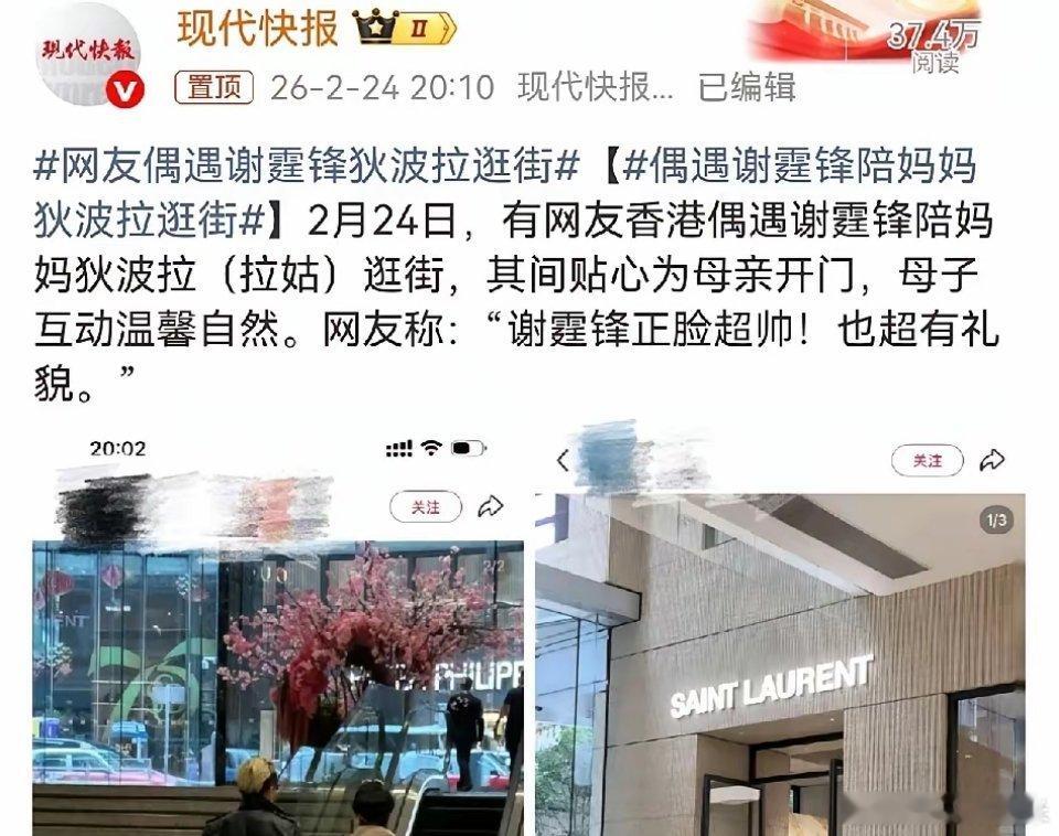 谢霆锋,冲上热搜!2月24日深夜,谢霆锋连夜冲上了高位热搜,这次不是因为电影,而是他罕见的陪着74岁狄波拉逛街,没有保镖助理、不摆明星架子,全程贴心开门、轻揽母亲肩膀,边走边聊松弛又温暖。很多人只记得他是舞台上酷拽的歌手、银幕上硬朗的演员,却忘了他也是把妈妈放在心上的儿子。当天谢霆锋一身黑皮衣简约帅气,狄波拉白色小香风外套优雅减龄,母子同框像姐弟般养眼。他主动为拉姑开门、护着她走路,细节里全是藏不住的孝顺,网友直呼“正脸超帅,还超有礼貌”。常年奔波工作的他,难得卸下光环回归家庭。这份不刻意的陪伴,比任何红毯造型都动人。明星身份之外,接地气的亲情才是最打动人的地方。也有网友称,如今的谢霆锋太忙了,工作安排得已经很满了,除了陪父母,还有两个儿子需要陪伴,除此之外,还有更需陪伴的伴侣王菲。