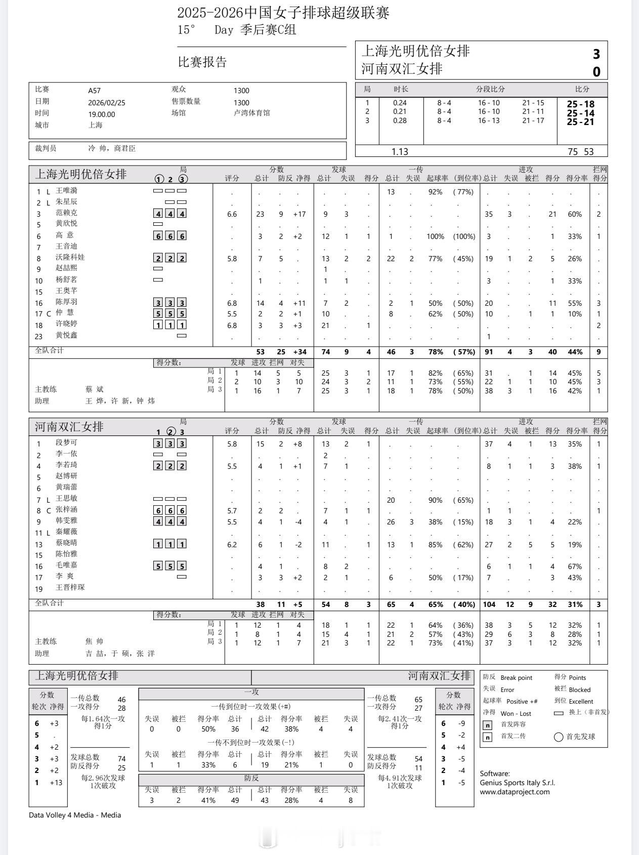 【技术统计】排超联赛季后赛第1轮,上海女排3比0河南女排(25-18 25-14 25-21)