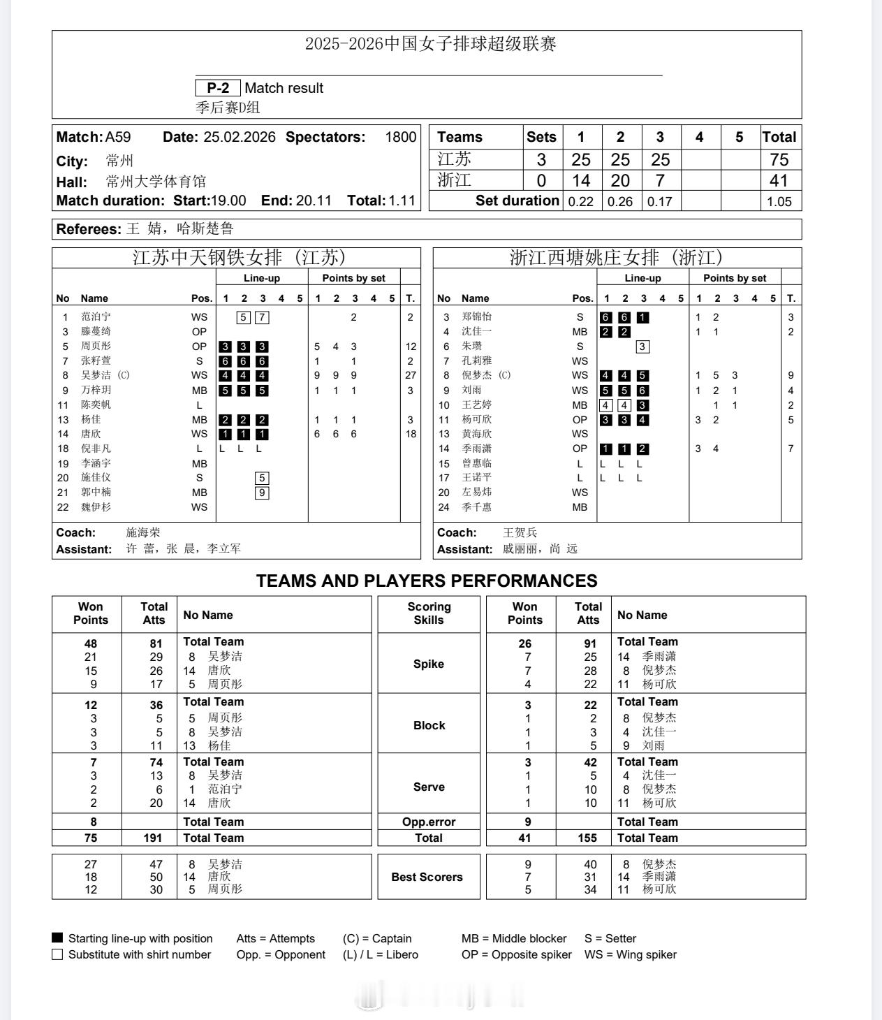 【技术统计】排超联赛季后赛第1轮,江苏女排3比0浙江女排(25-14 25-20 25-7)