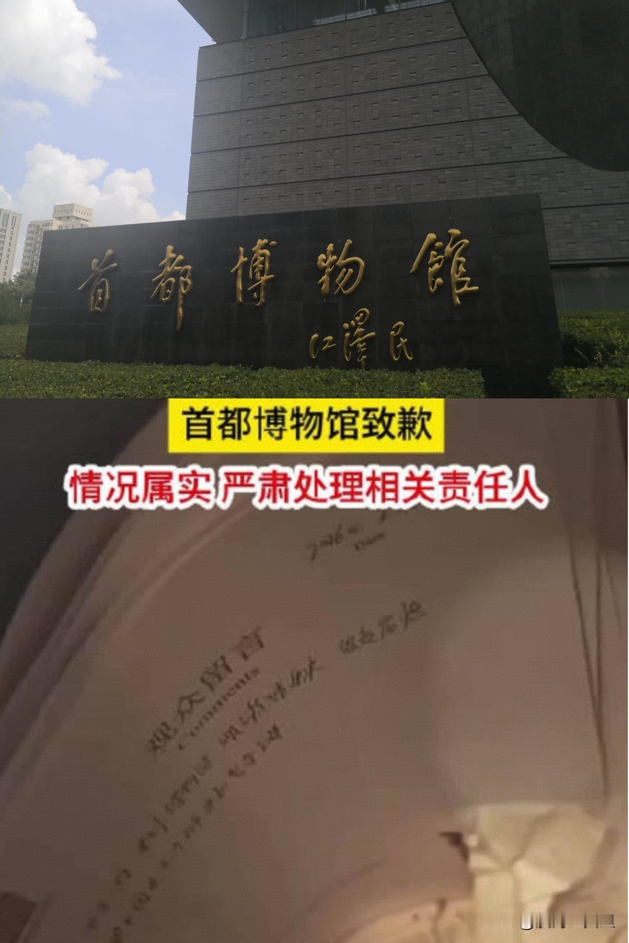 首都博物馆上班第一天收到质疑 第二天速度道歉 对质疑视频承认属实并发布通报 针对观众留言就被扔事件做出处理 不仅处理相关责任人 还承诺加强对员工的培训和管理工作 并认真吸纳意见和建议 持续关注首博落实“建章立制”的承诺