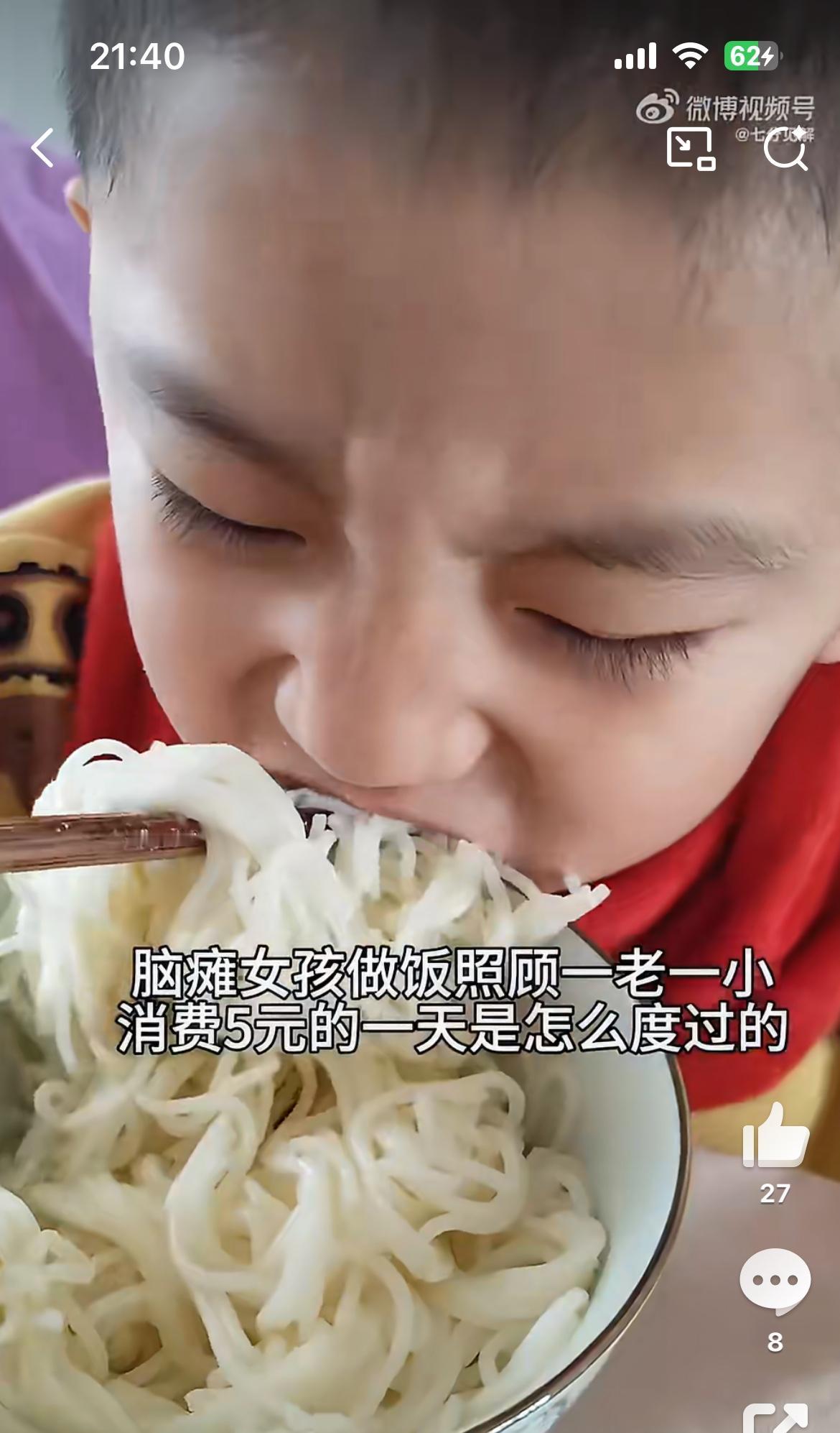 看着太心酸了,脑瘫女孩一天只花5块照顾一老一小的生活,菜里见不到一点油花和荤腥。不知道什么原因,家里就3口人,父母没见到,爷爷看起有病,弟弟看起来正常,但是太小,生活的重担全部压到女孩身上,看她的动作很迟缓、吃力,但是一直坚持着。早晨起来给一老一小做面条吃,就一碗光面,啥没放。中午白菜煮豆干,放了一滴油润锅。晚上青菜南瓜,又是一样。没有油,没调料,没有一点荤,比庙里吃的还清汤寡水。