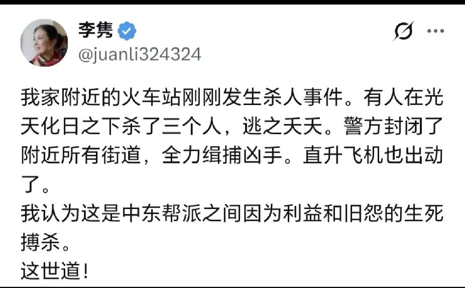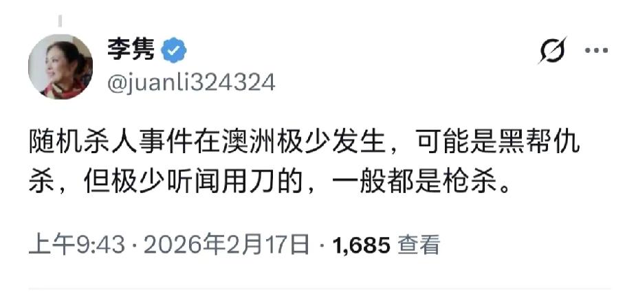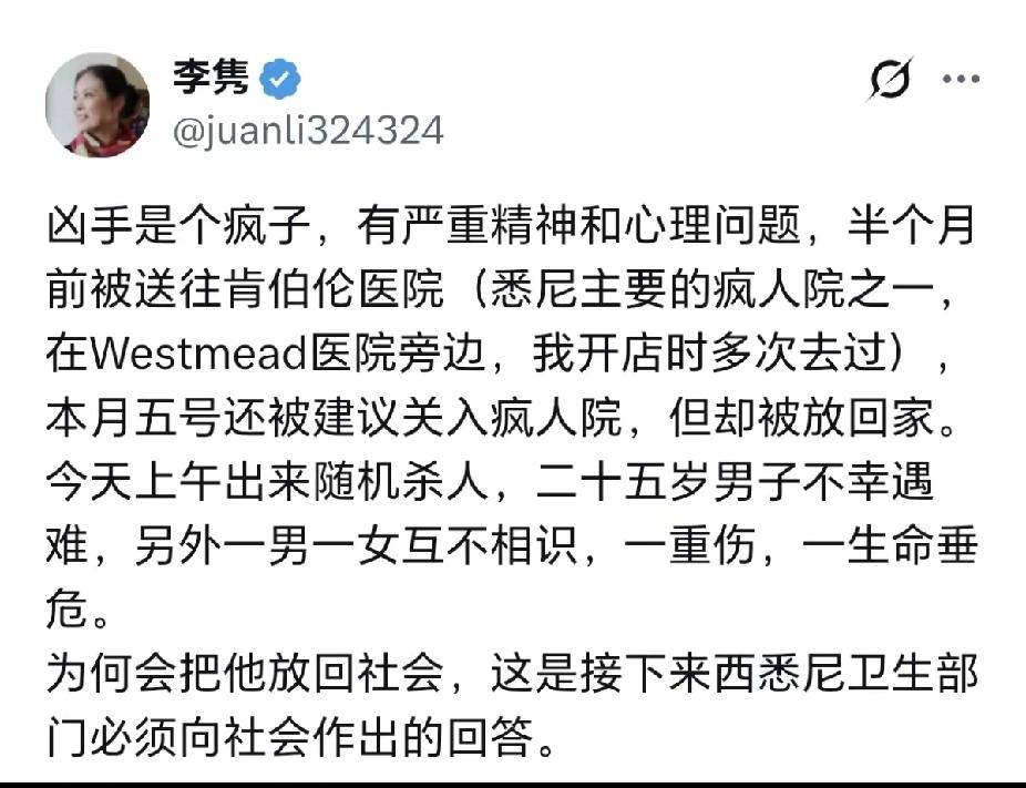 大年初一,磁吸太后李隽的“天堂”碎了一地!🇦🇺 知名“润人”公知李隽,在农历新年第一天本来心情挺好,还发帖祝各位朋友新年好呢。结果没一会儿,她家附近火车站就发生了凶杀案,三人死伤,让她瞬间没了安全感。 更有意思的是,面对惨案,她的操作让人看傻了: 先是往“中东帮派纷争”上甩锅,接着又辩解“澳洲很少发生恶性案件”,最后甚至直接甩锅给“被放出来的精神病人”,还喊话卫生院要解释。 说实话,看着她这手忙脚乱的样子,我真笑了! 平时在网上天天吹西方“民主自由”、捧脚底板当金子,骂祖国这不好那不好。结果真遇到血光之灾,那个所谓的“人间天堂”,怎么就保护不了她了? 双标玩得也太溜了,这脸打得啪啪响!哪里都有阴暗,别总把坏当优越,清醒点吧!