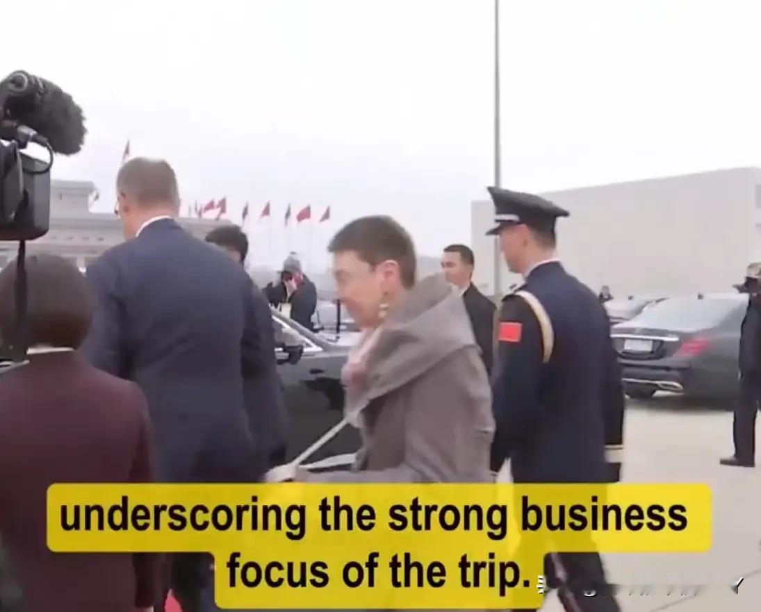 2月25日德国总理抵达访华第一站受到隆重欢迎,走在机场的红毯上,一位穿着军装的兵