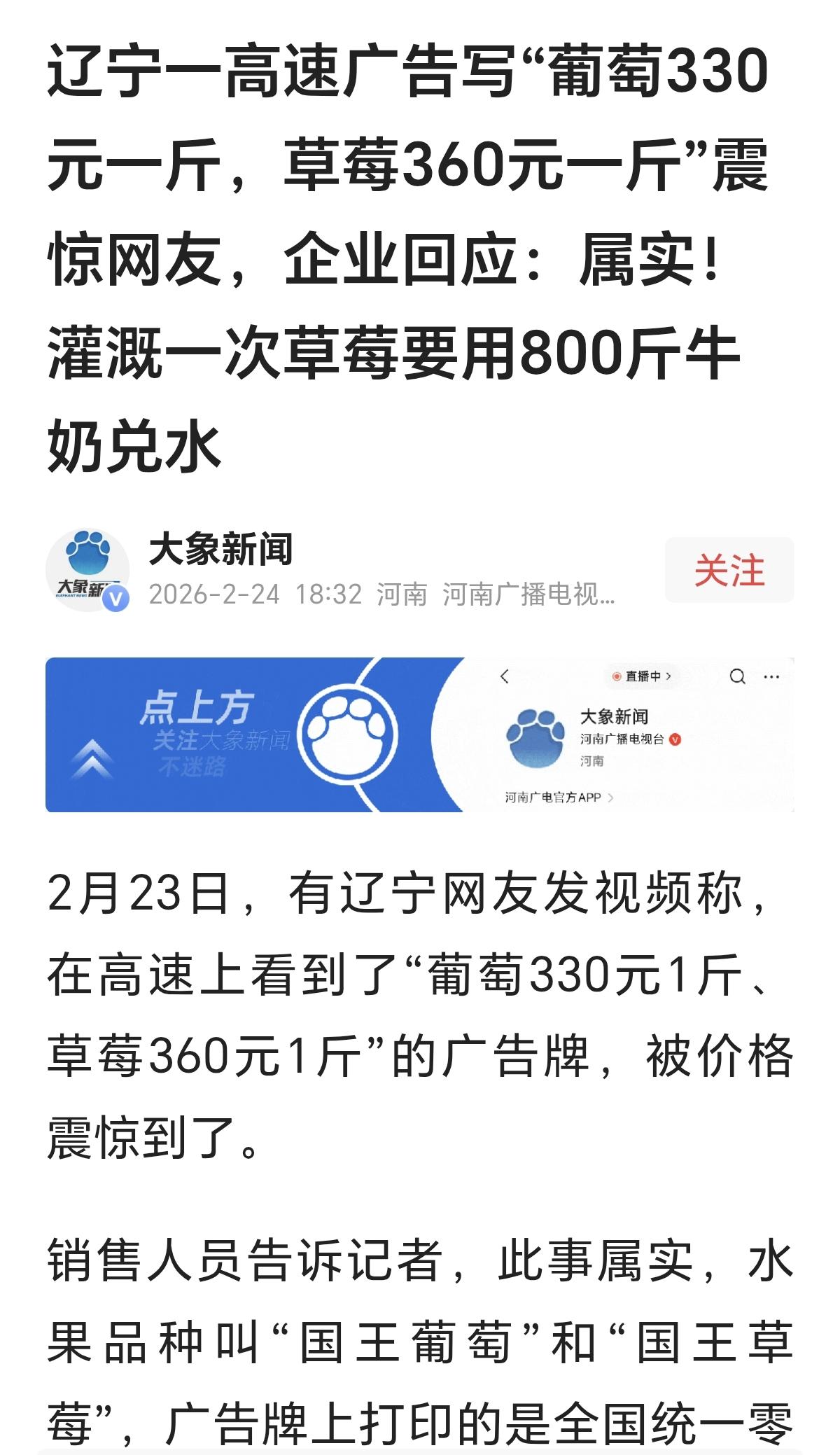 360元一斤的草莓?别说吃过,我连听都没听说过。看到这条广告的人都会震惊吧?这样的草莓卖给谁? 据报道,高速路上的广告,葡萄330元一斤,草莓360元一斤,并不是噱头,而是确有其事。 为什么这么贵? 该企业解释说,这是原生态的,给草莓浇一次水就要用800斤牛奶兑水。 有的网友说,人家也是明码标价的,没有问题。 有的网友说,标多少价是人家的事,买不买是你的事。 葡萄和草莓好不好吃,我能理解这和土壤、肥料以及自然环境有关,但确实不懂牛奶的作用。 不管怎么说,我是不会买这个价格的草莓吃的,只是当个新鲜事儿听听。