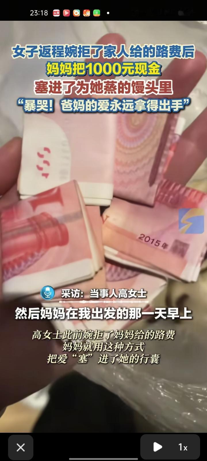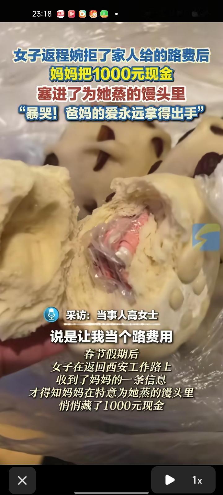 2月24日,大连瓦房店市。春节假期后,高女士回西安的路上,收到了妈妈的一条消息,才得知妈妈特意为她蒸的馒头里悄悄藏了1000元现金。原来,高女士此前婉拒了妈妈给的路费,妈妈便用这种方式将爱“塞”进了她的行囊。她表示,看了妈妈发的消息,她爆哭起来,我对爸妈的爱从不吝啬,特别幸福。