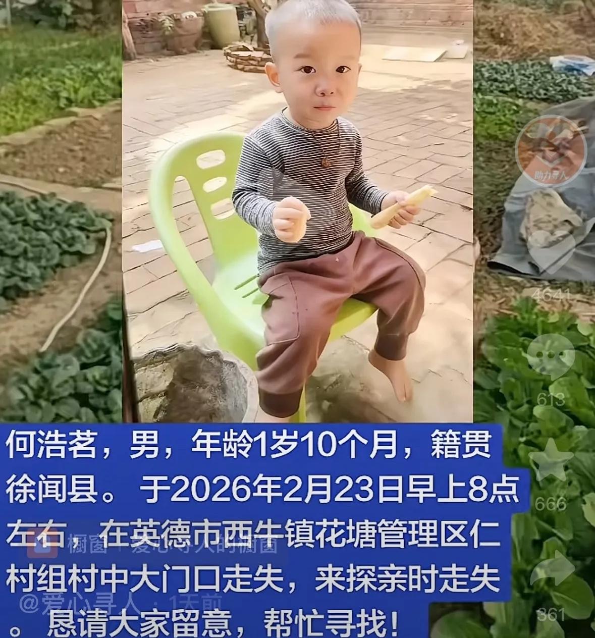 这个宝宝是广东湛江徐闻人叫何浩茗,年龄才一岁半,事发当天跟着妈妈去外婆家拜年,没想到就一会的功夫人不见了,被找到时是在距离村庄500米的山塘里,真的是太心痛了! 2月23日早上8时左右,何浩茗的家人就已经忙碌了起来,他独自一个人玩耍。 正当大家忙完后,发现何浩茗不见了,彼此询问后,都以为是在照顾他,没想到自己手头上有事就疏忽了,等到闲下来时才发现他不见了。 对于外婆家的环境,才一岁半的何浩茗根本不熟悉,他们家距离外婆家英德市西牛镇距离是很远的,他的母亲属于远嫁,可能只有过年才能短暂的相聚,没想到十几分钟的时间孩子就不见了。 于是,家人散出去寻找,同时也报了警,甚至在媒体上发布了寻人启事,可两天过去了,范围逐渐在扩大,最后只在林子里找到了他的鞋子。 最让人不能接受的是,在距离外婆家500米元的一处山塘里发现了小浩铭,此时他已经没有了生命体征。 何浩茗的离去,家人是无法接受的,如果目光不离开他,就不会独自出门,就不会发生这样的结果。 可惜,世上没有后悔药可吃。 一个一岁半的孩子,正是对万物好奇的时候,到了外婆家一个陌生的环境,会使他好奇想接触想探索,所以想出门。 所以这个悲剧告诉我们,真的要看好身边的孩子,无论多大,都有一颗好奇的心。一定要让孩子在视线之内,不要因为一时的忙碌而忘了照看。 真的是太心痛了,多么可爱的孩子,发生这样的事情,让他的爸妈可怎么活啊?