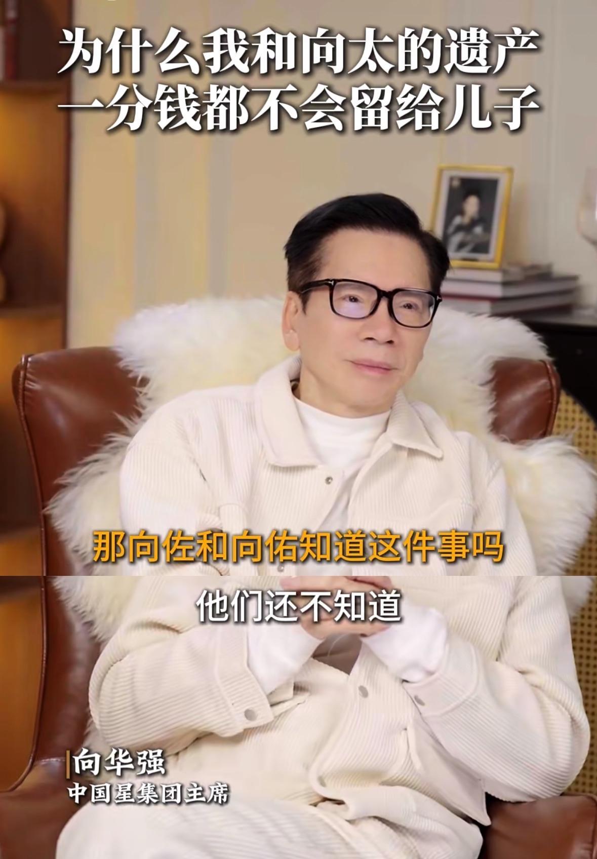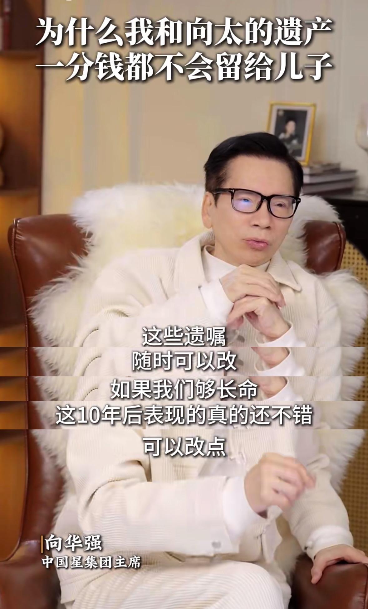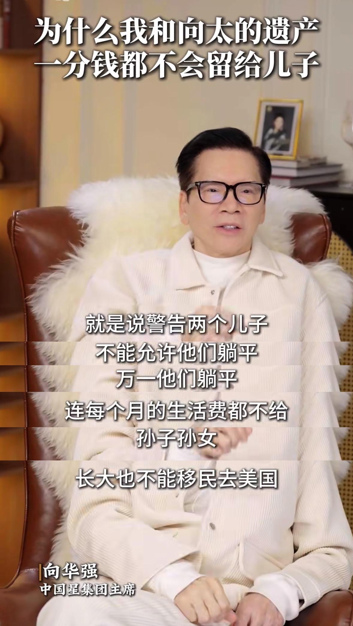 向华强表示将立遗嘱所有财产交由郭碧婷管理,想不通夫妻俩精明一辈子,为何两个儿子都很容易被人骗,家财给儿子,没多长时间就会给人骗走。 向华强及向太皆相信郭碧婷的人品,认为她可以把孙辈教导的很好,向太的珠宝将通过郭碧婷传给孙女。 他们对后代有两个要求,一是两个儿子不能躺平,如果躺平生活费都不会给;二是孙子孙女不可以去美国读书甚至移民,如果移民遗产没得分。 这份遗嘱,如果他和向太活得够久,仍有修改可能,修改遗嘱将作为激励政策,希望能够以此激励两个儿子靠谱一点。