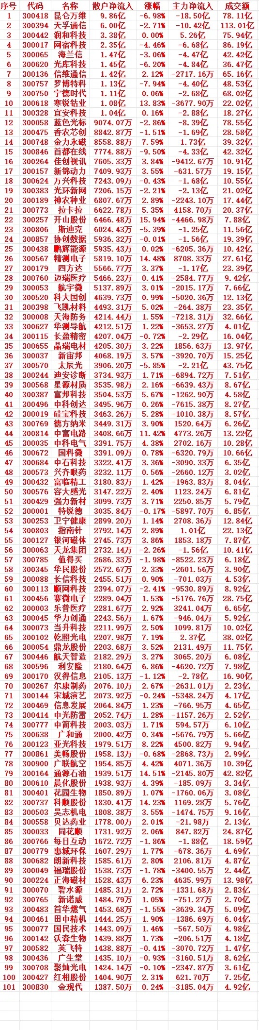 1 300418 昆仑万维 9.86亿 -6.98% -18.50亿 78.11亿2 300394 天孚通信 6.00亿 -2.71% -10.42亿 113.01亿3 300442 润和科技 3.38亿 0.00% 5.26亿 75.94亿4 300017 网宿科技 2.35亿 -4.46% -6.68亿 86.19亿5 300065 海兰信 1.47亿 -3.06% -4.47亿 42.42亿6 300620 光库科技 1.45亿 -6.20% -4.84亿 36.47亿7 300136 信维通信 1.42亿 2.12% -2717.16万 65.16亿8 300757 罗博特科 1.13亿 -7.94% -4.40亿 48.53亿9 300750 宁德时代 1.11亿 0.06% -2.68亿 68.02亿10 300618 寒锐钴业 1.08亿 13.83% -3677.90万 22.02亿11 300328 宜安科技 1.04亿 0.16% -2.88亿 18.27亿12 300058 蓝色光标 9074.07万 -2.86% -8.39亿 78.55亿13 300475 香农芯创 8842.87万 -1.51% -1.69亿 28.58亿14 300748 金力永磁 8558.88万 7.59% 1.73亿 39.32亿15 300846 首都在线 7774.88万 -9.50% -4.33亿 42.32亿