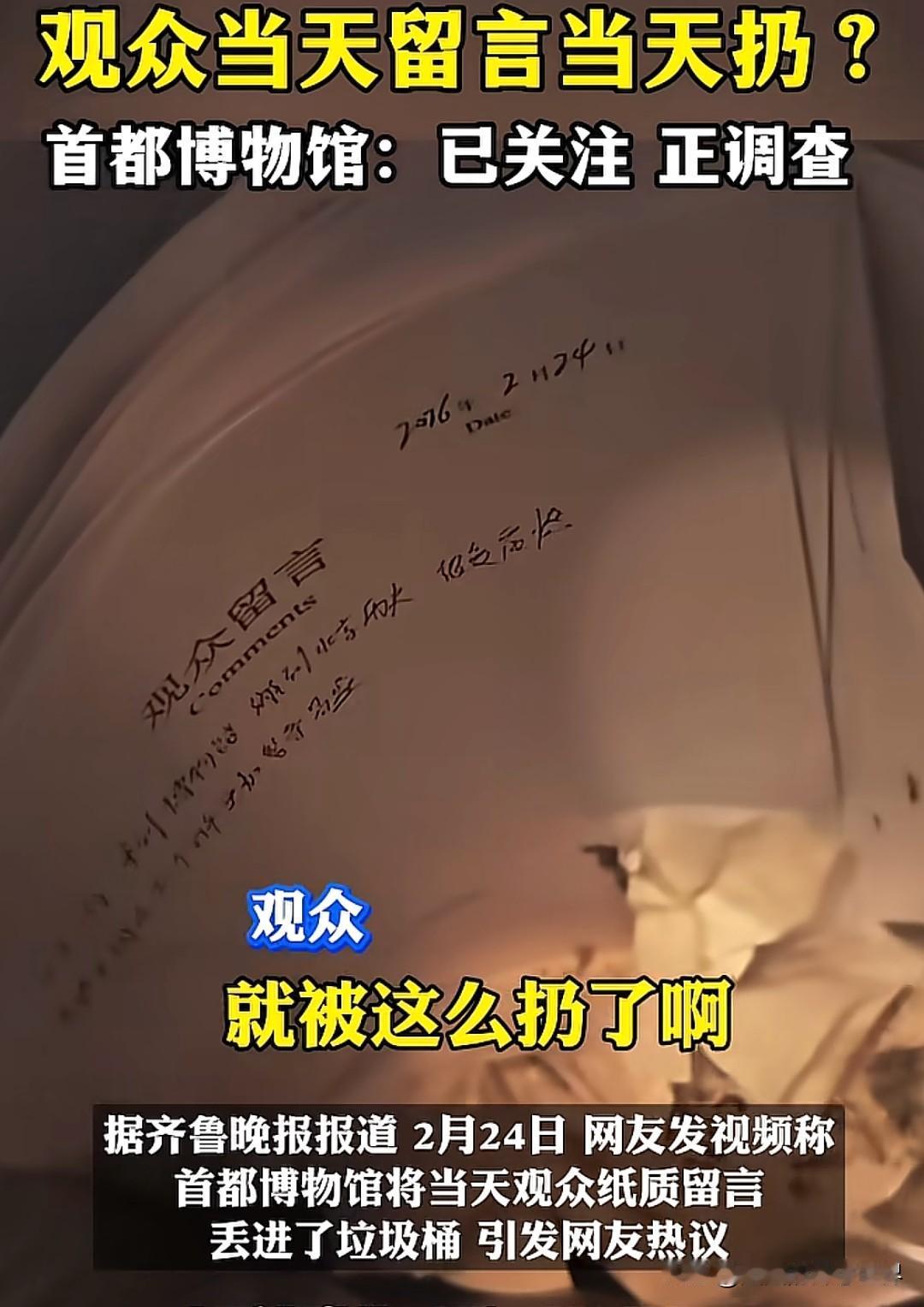 首都博物馆被拍到将观众当日留言纸团成废纸扔进垃圾桶的瞬间,刺痛了无数普通人的心。那些字迹工整的“建议增加互动环节”“灯光太暗看不清文物”的留言,还带着书写时的温度,转眼就被当作垃圾处理。有人轻描淡写地说“这很正常,普通人的意见本来就没人在意”,可当“表达权”沦为一场自欺欺人的表演,当“听取民意”变成一句空洞的口号,我们失去的,真的只是几张纸吗? “让你留言是给你表达的机会,但你人微言轻”——这句话像一盆冷水,浇灭了无数人“被看见”的期待。我们在景区留言墙写下心愿,在政务平台提交建议,在社交媒体分享感受,却很少追问:这些声音真的抵达了目的地吗?就像博物馆的留言本,本应是连接观众与机构的纽带,如今却成了“应付检查”的工具。有网友自嘲:“以前以为留言会被认真阅读,现在才明白,我们不过是给留言本‘凑字数’的群演。”这种“形式主义的尊重”,比直接拒绝更让人心寒。 更令人愤怒的是“巨婴论”的绑架:“成年人如果连这点常识都没有,那可真是幼稚。”仿佛期待自己的声音被重视是“不懂事”,相信“留言会被处理”是“太天真”。可社会的进步,恰恰是由无数“人微言轻”的声音汇聚而成的。从消费者吐槽外卖塑料袋污染,推动环保政策出台;到网友反映老旧小区电梯故障,促使加装工程落地——每一个看似微小的声音,都可能成为改变的起点。如果所有人都因为“说了也没用”而沉默,那“表达权”不过是一张废纸。博物馆扔掉的不仅是留言纸,更是对公众的轻视,是对“共建文化空间”承诺的背叛。 “普通人的意见,就该被扔进垃圾桶吗?” 有人辩解“博物馆每天接待万人,哪有时间看留言”,也有人反驳“既然设置了留言渠道,就该履行基本责任”。其实,问题的关键不在于“是否看完所有留言”,而在于是否尊重每一份表达的诚意。就像故宫博物院会定期整理观众反馈,甚至为一条“展签字体太小”的建议重新设计——真正的文化机构,不会把观众的声音当累赘。 从博物馆扔留言到“说了白说”的普遍心态,我们正在陷入“集体沉默”的怪圈。今天我们对“留言被弃”习以为常,明天就可能对更重要的权益视而不见。下次再被人说“你的意见不重要”时,或许可以反问:如果连“被听见”的权利都被剥夺,那所谓“真实”的社会,该有多冷漠?你说呢?