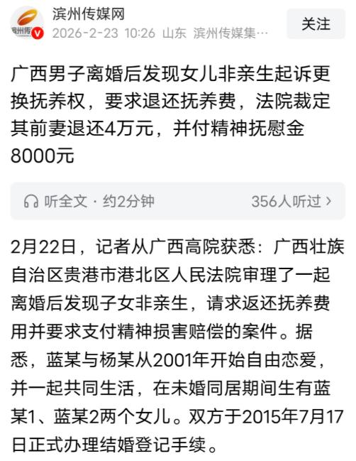 广西,男子离婚后小女儿归他抚养,大女儿归前妻,渐渐他发现小女儿不像自己,怀疑不是亲生,便去做了亲子鉴定,结果让他五雷轰顶,小女儿果真不是他亲生的,男子一怒之下告上法院,要变更抚养权,并要求前妻返还抚养费,赔偿精神损失费,法院判决让人意外。 事情发生在广西当地一个普通家庭,男子和前妻结婚多年,先后生下了两个女儿,大女儿乖巧懂事,小女儿活泼可爱,一家四口的日子虽不算富裕,却也平淡安稳。 可随着时间推移,两人之间的矛盾越来越多,争吵不断,感情也渐渐走到了尽头,最终无法调和,选择了协议离婚。 离婚时,两人经过协商,约定大女儿归前妻抚养,小女儿则由男子抚养,双方各自承担对应孩子的抚养费,平日里也会互相探望孩子。 男子十分疼爱两个女儿,尤其是归自己抚养的小女儿,离婚后,他辞掉了经常加班的工作,找了一份时间相对自由的差事,就是为了能多陪伴小女儿成长,给她足够的关爱。 起初,男子并没有任何疑虑,只当小女儿是随了前妻的长相,可随着小女儿慢慢长大,五官越来越清晰,他心里的疑惑也越来越强烈。 他悄悄采集了自己和小女儿的样本,送到了专业的司法鉴定机构,接下来的几天,他度日如年,既期待又害怕,期待真相大白,又害怕听到那个最不愿接受的结果。 直到鉴定报告出来的那天,他颤抖着双手打开报告,上面的一行字,让他瞬间浑身冰凉,五雷轰顶——排除该男子为小女儿的生物学父亲。 那一刻,男子感觉整个世界都崩塌了,自己掏心掏肺养了三年的孩子,竟然不是自己的亲生女儿,自己三年来的付出、疼爱和陪伴,都成了一个笑话。 他想起自己为了小女儿,放弃了更好的工作机会,省吃俭用给孩子买衣服、买零食、报兴趣班,哪怕自己受委屈,也从不让孩子受一点苦,可到头来,却发现自己是在替别人养孩子。 愤怒和委屈瞬间淹没了他,他第一时间联系前妻,质问事情的真相,可前妻要么避而不见,要么就矢口否认,丝毫没有愧疚之意,甚至还指责他无理取闹。 被前妻的态度彻底激怒后,男子没有再纠缠,直接收集了亲子鉴定报告、三年来支付抚养费的转账记录、购物凭证等相关证据,将前妻告上了法庭。 他在起诉状中明确提出,要求法院判决变更小女儿的抚养权,将孩子交由前妻抚养,同时要求前妻返还自己三年来为小女儿支付的所有抚养费,共计四万多元,还要赔偿自己的精神损害抚慰金,弥补自己这三年来的付出和受到的伤害。 身边的亲戚朋友都很支持他,觉得前妻隐瞒真相、欺骗他的行为太过分,男子的诉求合情合理,胜诉是必然的。 网友们得知此事后,也纷纷替他打抱不平,有人说前妻违背了夫妻间的忠实义务,就该承担所有责任,还有人说,男子不仅要追回抚养费,还要让前妻付出更严重的代价。 所有人都以为,法院一定会支持男子的全部诉求,可让人意外的是,法院经过审理后,做出的判决却超出了所有人的预料。 法院判决变更小女儿的抚养权,由前妻负责抚养,同时判决前妻返还男子部分抚养费,共计两万多元,但驳回了男子要求赔偿精神损害抚慰金的诉求。 法院认为,男子在不知情的情况下抚养非亲生子女,有权要求前妻返还相应的抚养费,但考虑到前妻的经济条件一般,且男子在抚养期间也获得了情感慰藉,因此酌情判决返还部分抚养费; 而男子主张的精神损害抚慰金,因未能提供充分证据证明前妻的行为给其造成了严重的精神损害,因此不予支持。 男子得知判决结果后,虽有不甘,却也接受了这个结果,只是一想到自己三年的付出,依旧难以释怀。对此,你们有什么看法,欢迎评论留言~