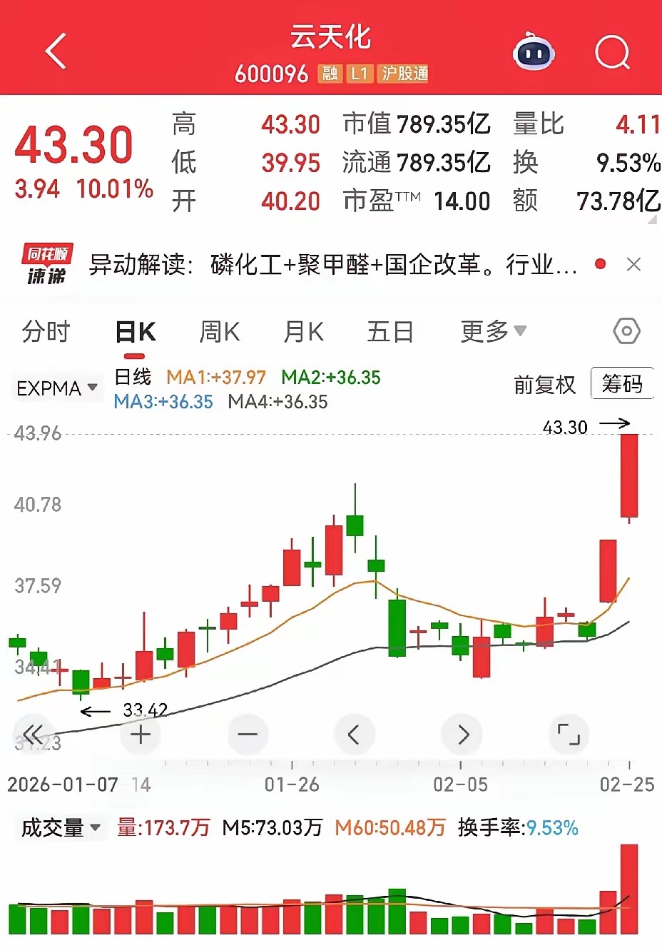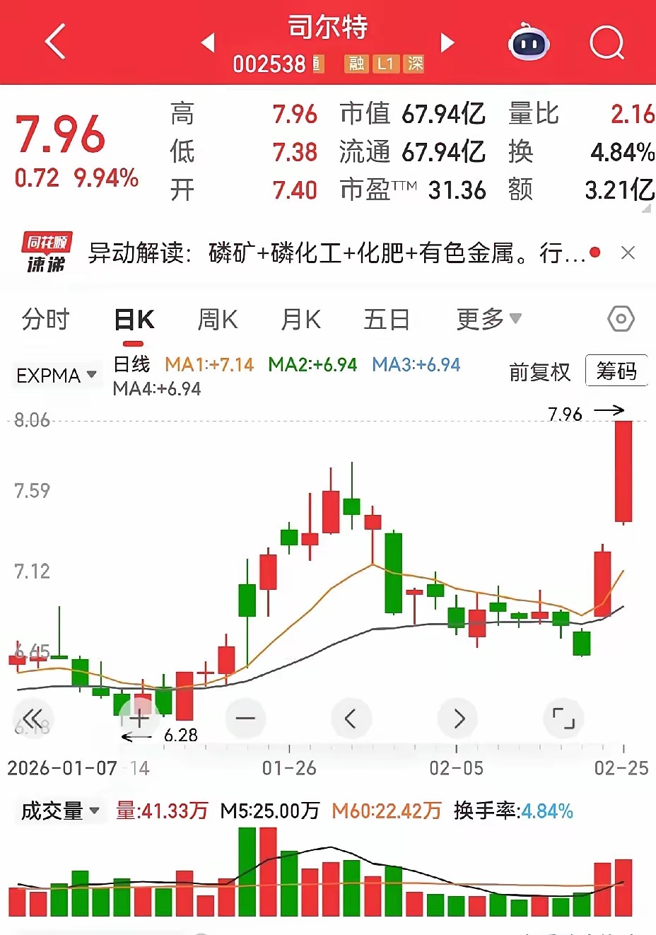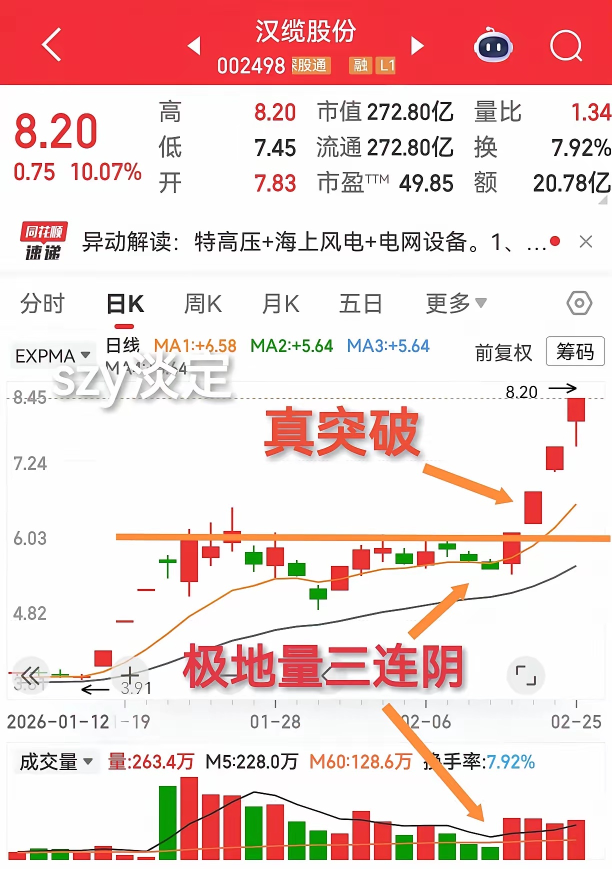 昨天说的磷化工一路走势比较强,今天继续高唱凯歌,几个两连板的票值得跟踪,后面不会大家继续保持同一种上升态势,势必有所分化。分化也有分化的好处,分化中才能分辨出谁是龙头。但是此时不宜追高,等待分化后的重启,就像当初的特高压一样,大家一起大涨,涨过以后开始回调,最近汉缆股份以其强劲的四连板走势,显示出高贵的龙头气质,如果一直关注该股的高手,应该不会错过此轮行情。可惜我错过了,三连阴后第一个涨停板时,我看到的也是有机会上车的,但没有引起足够重视,认为调整的时间不够充分,想着在等几天,结果完美错过。实际上还是技术不过硬,心态不够平,分析不够理性,缺点很明显啊。特别提醒:贴图欣赏,并非推荐,
