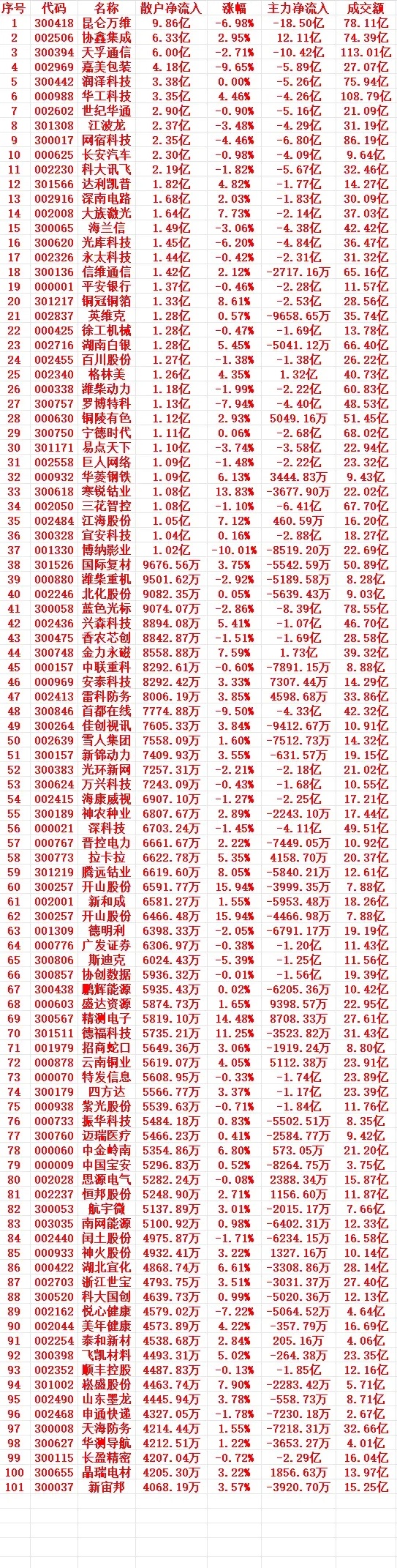 1 300418 昆仑万维 9.86亿 -6.98% -18.50亿 78.11亿2 002506 协鑫集成 6.33亿 2.95% 12.11亿 74.39亿3 300394 天孚通信 6.00亿 -2.71% -10.42亿 113.01亿4 002969 嘉美包装 4.18亿 -9.65% -5.89亿 27.07亿5 300442 润泽科技 3.38亿 0.00% -5.26亿 75.94亿6 000988 华工科技 3.35亿 4.46% -4.26亿 108.79亿7 002602 世纪华通 2.90亿 -0.90% -5.16亿 21.09亿8 301308 江波龙 2.37亿 -3.48% -4.29亿 31.19亿9 300017 网宿科技 2.35亿 -4.46% -6.80亿 86.19亿10 000625 长安汽车 2.30亿 -0.98% -4.09亿 9.64亿11 002230 科大讯飞 2.19亿 -1.82% -5.67亿 32.46亿12 301566 达利凯普 1.82亿 4.82% -1.77亿 14.27亿13 002916 深南电路 1.68亿 2.03% -1.83亿 30.09亿14 002008 大族激光 1.64亿 7.73% -2.14亿 37.03亿15 300065 海兰信 1.49亿 -3.06% -4.38亿 42.42亿