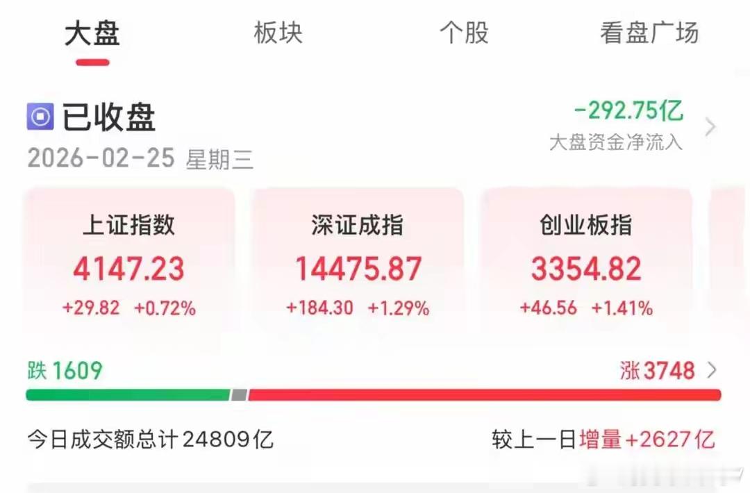 大盘飘红却难赚钱:量化收割+资金恐高双重压制2月25日,A股继续收红,但赚钱效应明显走弱,体现出资金高位恐高、主动落袋为安的心态。盘面个股涨多跌少,超3700家飘红,地产、新能源领涨,影视、游戏、银行等板块走弱。板块要点1. 地产板块受上海楼市新政催化,板块大幅走强,我爱我家、华联控股、城投控股等多股涨停。随着万科利空落地,板块已走出波段底部,具备进一步反弹、冲击去年高点的潜力。但在管理层“慢牛”导向下,更适合回调整理后低吸布局,不宜追高。2. 影视板块延续深度调整,横店影视、博纳影业连续两日跌停。主因是节前涨幅偏大,叠加春节票房不及预期,板块进入震荡休整阶段,当前以规避观望为主。盘面核心特征今日市场最突出的特点是:蓝筹与题材快速轮动、高低切换频繁。追高极易被套,低吸收益也有限,本质是量化资金高频收割与存量资金逢高减仓共振的结果。指数策略当前指数已运行至各周期相对高位,虽仍有冲击4190的动能,但上方压力明显加大,后续存在回踩需求,重点关注4100乃至4050一线强支撑。操作上建议逢高减仓、控制仓位,不盲目追涨。