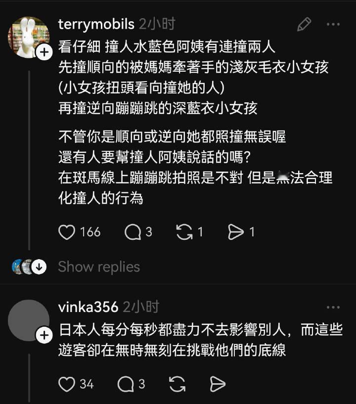 台湾省妈妈给女儿拍照的时候,被日本女子故意撞倒在地,看了视频,这名女子分明是故意的,本来是要撞灰色小女孩,但是小女孩躲过了之后,又故意撞上了这个穿牛仔衣的小女孩 现在很多台湾网友都在反思了,虽然日本人很恨游客,但是架不住他们硬要去旅游