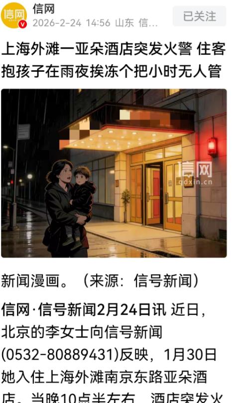 离大谱!上海,女子花近1500元,带孩子入住外滩某知名品牌大酒店,当晚10点半左右,突然被火警警报惊醒。慌乱中,她抱着孩子冲到室外,就这样母子衣着单薄在雨中滞留近一小时。过程中,没有酒店工作人员引导疏散,没人提供雨伞、热水,没人通知何时解除警报。等回到酒店,母子二人浑身湿透,冻得瑟瑟发抖。而后续酒店的做法,更令人大跌眼镜! 谁能想到,花近1500元在上海外滩住知名品牌大酒店,本来想带孩子好好享受一番,结果却遭遇了一场让人又怕又气的闹剧,不仅被火警警报吓得魂飞魄散,还带着孩子在雨里冻了近一个小时,而酒店后续的操作,更是让人跌破眼镜。 事情就发生在上海外滩,一名女子特意带孩子来这边游玩,为了让孩子住得舒服,也图个方便,她特意挑选了外滩附近一家知名品牌大酒店, 花了近1500元办理了入住,本以为能拥有一段舒心的住宿体验,没曾想,这场看似体面的住宿,却变成了一场煎熬。 当天晚上10点半左右,母子二人已经洗漱完毕,准备休息,整个酒店也渐渐安静下来。就在这时,刺耳的火警警报突然响起,声音尖锐又急促,哪怕关着房门,也能听得清清楚楚,瞬间打破了夜晚的宁静。 女子被警报声猛地惊醒,大脑一片空白,第一反应就是孩子的安全,来不及多想,她慌忙起身,连厚衣服都没来得及给孩子和自己多穿一件,就抱着孩子,慌慌张张地冲出了房间。 冲出房间后,走廊里一片混乱,不少住客都和她一样,被警报声惊醒,慌不择路地往楼下跑。让她没想到的是,整个疏散过程中,竟然没有一名酒店工作人员出面引导, 没有人告诉大家该往哪里撤离,也没有人提醒大家注意安全,甚至连一句安抚的话都没有。大家只能凭着本能,顺着楼梯往楼下跑,生怕真的发生火情。 等她抱着孩子冲到酒店室外,才发现外面正下着雨,夜晚的上海气温偏低,寒意刺骨。而她和孩子,身上只穿了单薄的家居服,连件外套都没有, 她抱着孩子,缩在墙角,想找个避雨的地方,却发现周围没有任何遮挡,也没有酒店工作人员主动递来雨伞、送上热水。 就这样,母子二人衣着单薄地在雨中滞留,一秒、十分钟、半小时……整整将近一个小时的时间里,没有任何人来通知他们警报何时解除,也没有任何酒店工作人员过问他们的情况。 期间,她多次抬头望向酒店门口,始终看不到工作人员的身影,也没人出来说明情况,不知道这场警报到底是真火情,还是误报。 直到近一个小时后,警报声才终于停止,有住客试探着往酒店里走,她才抱着冻得瑟瑟发抖的孩子,跟着大家一起回到酒店房间。 此时,母子二人浑身湿透,头发滴着水,手脚冻得僵硬,孩子更是因为受了惊吓,加上受凉,一直小声啜泣,看着让人心疼。她赶紧给孩子擦干身体、换上干净衣服,又煮了热水给孩子暖身,可孩子还是冻得直打哆嗦。 本以为警报解除后,酒店会有人出面解释情况,哪怕是一句道歉、一句安抚也好,可让她万万没想到的是,酒店的做法,比让他们在雨中挨冻更令人大跌眼镜。 回到酒店后,没有任何工作人员主动联系她,没有询问孩子的身体状况,也没有对此次疏散混乱、未提供任何帮扶的情况作出任何解释,甚至连一句简单的道歉都没有。 她主动找到酒店前台询问情况,工作人员也只是含糊其辞,要么说不清楚警报原因,要么就推脱责任,对于他们母子在雨中挨冻近一小时的遭遇,更是视而不见,没有提出任何补偿方案,也没有任何补救措施,仿佛这件事从未发生过一样。 要知道,当下酒店行业竞争激烈,服务质量和应急处置能力,早已成为大家选择酒店的重要标准,而这家知名品牌大酒店,却连最基本的安全保障和服务都做不到。 女子看着冻得还在发抖的孩子,心里又气又无奈,花近1500元住酒店,不仅没享受到应有的服务,反而让孩子受了这么大的罪,连最基本的安全保障都没有。 她只能默默拍下孩子湿透的衣服、冰冷的房间环境作为证据,打算进一步和酒店沟通,讨要一个说法。 随着这件事被分享到网上,也引发了不少人的关注,有人感慨酒店服务太过敷衍,也有人心疼母子二人的遭遇。毕竟,花钱住酒店,买的不仅是住宿,更是安心和保障。 对此,你们有什么看法,欢迎评论留言~