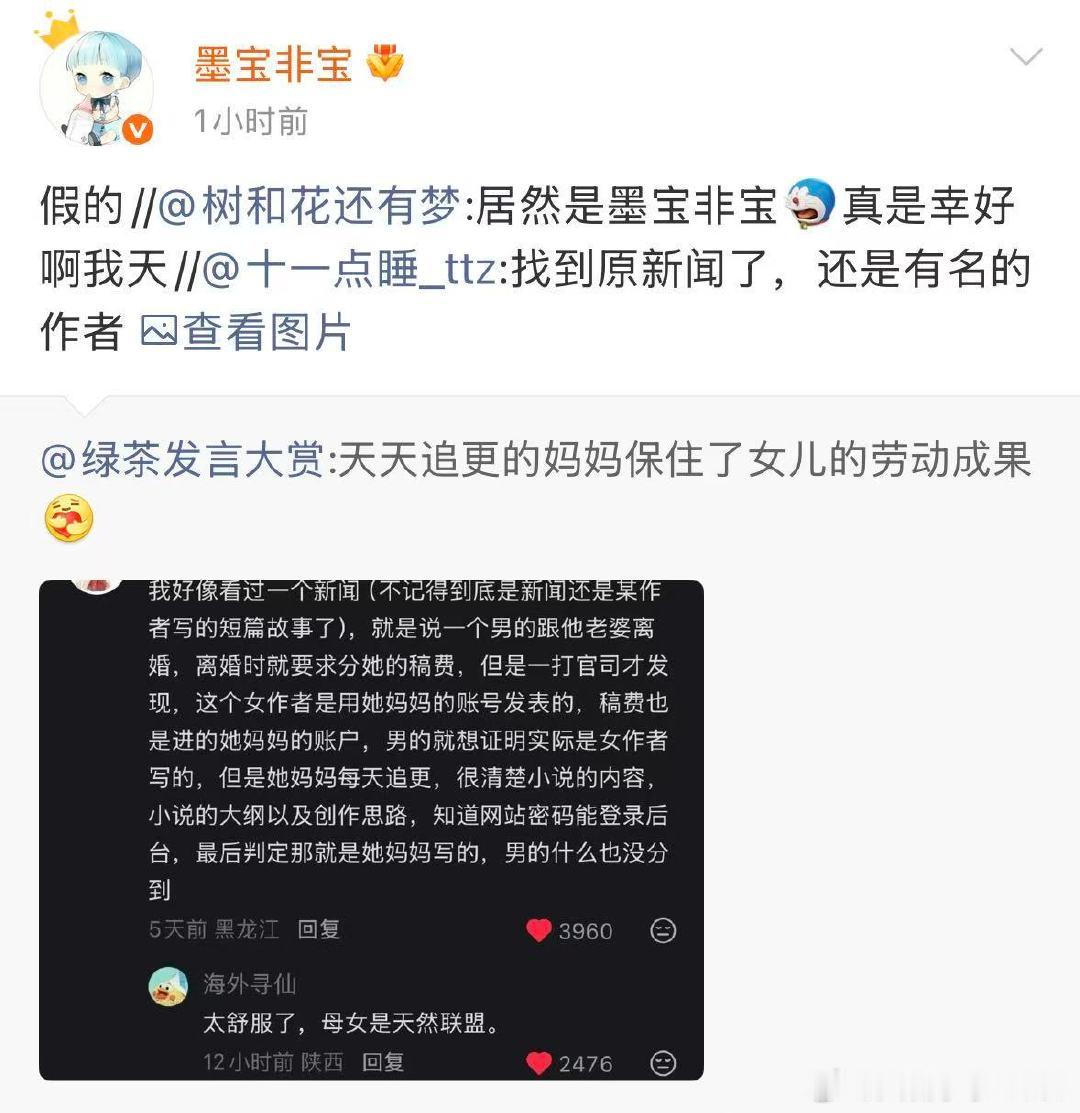 【墨宝非宝辟谣离婚分稿费传闻】墨宝非宝回应稿费传闻 2月25日,知名作家宣布已于21年离婚。对于网传离婚时分稿费的“情节”。墨宝非宝回应称:假的。墨宝非宝宣布离婚