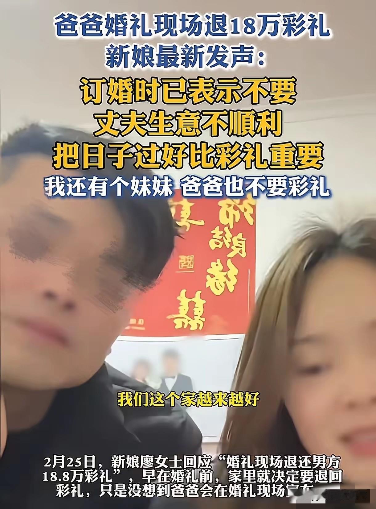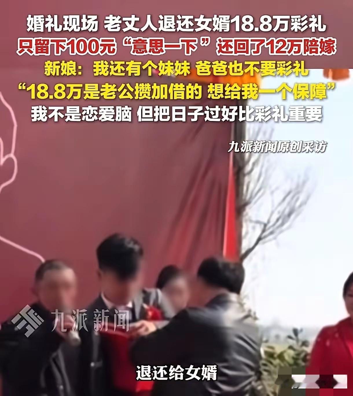 “人间清醒!”湖南益阳,男子有2个女儿,女儿们到了谈恋爱的年纪,他就和女儿们说:“以后我不要你们的彩礼,我也不希望你们向男方要彩礼。”大女儿结婚,女婿给了18.8万彩礼,男子仅留下100元意思一下,剩下的都退了回去,他还给了女儿12万陪嫁。男子在女儿婚礼上说的一番话,更是让人破防。 在湖南益阳,一位普通父亲的做法,让全网重新读懂了什么是真正为女儿着想,也让被天价彩礼裹挟的婚恋话题,迎来了最温暖、最通透的答案。 这位家里养育着两个女儿的父亲,从女儿们慢慢长大、开始接触感情的那一刻起,就始终保持着格外清醒的态度, 他从没有把彩礼当成女儿婚姻的标配,更没有把物质条件当作衡量幸福的标准,一直在用自己的方式告诉女儿,婚姻的根基是真心与责任,而不是金钱与交换。 随着年龄增长,家里的大女儿率先遇到了心意相通的伴侣,两人感情稳定,顺利走到谈婚论嫁的阶段。 按照当地的婚嫁习俗,男方家庭会准备一笔彩礼,表达对女方父母的感谢,也代表对这段婚姻的重视,女婿和家人也提前筹备好18.8万元彩礼,希望用最真诚的方式迎娶新娘。 消息传到父亲这里,他没有表现出丝毫欣喜,也没有默认收下这笔钱,反而提前和家人沟通好自己的想法,坚持用最简单、最纯粹的方式,成全两个孩子的新生活。 婚礼当天,现场温馨又热闹,满座宾客共同见证一对新人的重要时刻,彩礼交接环节如期到来。女婿郑重地将18.8万元彩礼送到父亲面前,全场目光都聚焦在这位父亲身上,可他没有全部收下,只是平静地从厚厚的礼金中抽出100元,轻轻放在桌上,当作一份心意的留存,剩下的所有钱款,全部当场退还给女婿。 这一幕让在场所有人都感到意外,更让人动容的是,父亲还提前准备了12万元陪嫁,亲手交到女儿手中,没有任何附加条件,只希望这笔钱能成为小两口未来生活的底气,让他们在刚组建家庭时少一点压力,多一点从容。 整场仪式没有刻意煽情,没有夸张表演,更没有世俗里常见的攀比与计较,父亲的每一个动作都沉稳而真诚,眼神里全是对女儿的不舍与祝福。 在婚礼致辞环节,他没有说长篇大论的道理,也没有强调自己的付出,只是用最朴实的语言,表达对新人的期盼, 希望两个人往后互相包容、彼此珍惜,把日子过好,不用被外界的物质标准绑架,也不用被世俗的眼光左右,只要内心安稳、彼此真心,就是最好的婚姻。 这段真实的婚礼画面被亲友记录下来传到网络后,立刻在全网引发强烈共鸣,短短几天内收获大量点赞与评论,网友们纷纷被这位父亲的格局与清醒打动。 有人留言说,这才是真正的人间清醒,父母之爱子,则为之计深远,他给女儿的不是金钱,而是一生的底气与尊严。 也有网友感慨,在很多家庭被天价彩礼压得喘不过气的时候,这位父亲用行动打破陋习,让婚姻回归本质,这样的父母才是子女最大的福气。 还有不少已婚网友分享自己的经历,有人因为彩礼问题和婆家产生隔阂,有人因为金钱争执毁掉最初的感情,对比之下更能体会到这位父亲做法的珍贵。 大家普遍认为,彩礼本来是祝福的象征,如今却慢慢变成衡量价值的工具,而这位益阳父亲,让人们重新看到婚嫁最原本的样子——没有算计,没有压力,只有成全与祝福。 也有网友表示,真正爱女儿的父母,从不会用女儿的幸福换金钱,他们只会尽全力托举孩子,让她们带着底气走进新的生活。 更多网友则称赞这位父亲通透又大度,不退彩礼是情分,全退是格局,再倒贴陪嫁,就是父母最无私的爱。 他没有因为世俗的眼光改变想法,也没有因为身边人的做法随波逐流,始终坚守自己的初心,把女儿的幸福放在第一位。 两个女儿在这样的家庭里长大,拥有的不仅仅是富足的生活,更是健全的人格、开阔的眼界和不被物质绑架的三观,这是比任何财富都珍贵的东西。 没有惊天动地的故事,没有博人眼球的操作,这位湖南益阳的父亲,用最朴素的行动,诠释了父母对子女最纯粹的爱,也给全社会上了一堂关于婚恋观、价值观的公开课。 在浮躁又现实的当下,这份清醒、大度与真诚,显得格外珍贵,也让更多人开始思考,婚姻真正的意义到底是什么。 对此,你们有什么看法,欢迎评论留言~