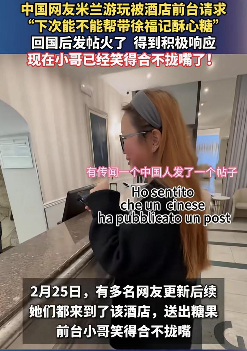 有个中国人意大利米兰旅游,他住的酒店前台小哥拜托他,下次去可不可以给他带一颗徐福记酥心糖。 他回国以后,发了个关于这件事的帖子,之后,去意大利旅游的中国人积极响应,不少人都给那个前台小哥带糖了。 这位小哥直接笑的合不笼嘴。