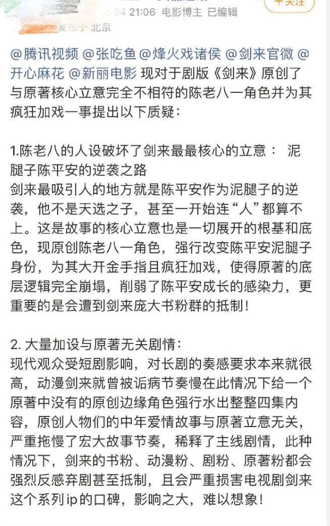 吴磊粉丝也在和《剑来》剧组维权! 《剑来》和《雪中悍刀行》是同一个作者,都是绝对的一番大男主剧,《剑来》小说粉和动漫粉非常多,《剑来》拍好了对吴磊的加成比《雪中悍刀行》对张若昀的加成更大,《剑来》小说字数是《雪中悍刀行》的三倍,肯定是要拍成系列剧,不过粉丝发现《剑来》剧版疑似在给配角加戏,所以也在维权。