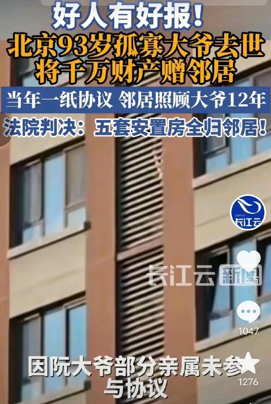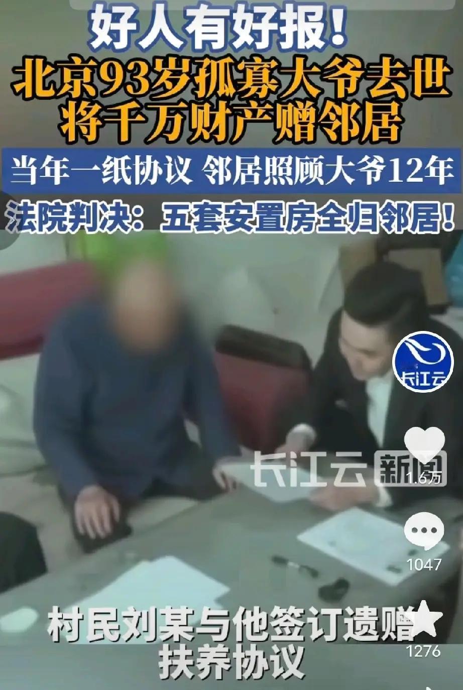 近日,北京93岁孤寡老人离世,将千万遗产全给赠给了邻居,包括5套安置房,当年一纸协议,邻居照顾12年,法院判定:协议有效! 阮大爷这辈子,说起来也是让人心酸,虽然身家不菲,可他终身未娶,无儿无女,到了晚年,这就成了要命的软肋。 年过八旬的他,行动越来越不便,日常买菜、做饭、打扫都力不从心,生病时连端水拿药的人都没有。远房亲属少有往来,独居的空荡房间里,连个说话的人都找不到,这样的晚年处境,戳中了很多孤寡老人的真实困境。 邻居刘某看老人实在艰难,主动伸出援手。2011年,在村委会的协调下,两人达成一致并签订书面协议,约定由刘某承担老人的生养死葬,老人离世后自愿把全部财产赠与刘某。这份约定不是一时兴起,是双方经过慎重考虑做出的选择,也成了老人晚年最踏实的依靠。 往后的12年里,刘某把承诺落到每一天的细节里。他按时给老人准备三餐,定期打扫房间,老人身体不舒服,他第一时间陪同就医、排队取药,全程陪护。逢年过节,他会陪着老人聊天解闷,不让老人独自过节,冰冷的屋子慢慢有了烟火气,老人的脸上也多了笑容。 2023年3月,阮大爷在律师见证下,再次签订遗赠扶养协议,把财产分配的内容写得更加明确,5套安置房和其他资产全部归刘某所有。老人清醒地知道,自己晚年的安稳生活,全靠邻居十几年如一日的付出,这份赠与,是他能给出的最真诚的回报。 老人离世后,部分亲属对遗产分配提出异议,案件进入诉讼程序。北京顺义区法院经过实地走访、多方取证,查清了全部事实。两份协议都是老人在意识清晰时自愿签署,内容不违反法律规定,不违背公序良俗,形式完整合规。刘某已经全面履行12年的照料义务,把老人的生活和身后事都安排妥当,完全符合协议约定的条件。 我国民法典明确规定,继承开始后,遗赠扶养协议的效力优先于法定继承。这项制度的设立,就是为了保障无子女、无赡养人的孤寡老人能老有所依,鼓励民间善意互助。法院最终作出判决,认定协议合法有效,5套安置房的全部权益归刘某继承,驳回了异议方的诉求。 这场判决没有偏向血缘,也没有偏袒财富,只守住了公平与善意。很多人感慨,血缘不该成为尽孝的唯一标准,12年的朝夕相伴、细心照料,早已超越了亲属间的情分。老人手握千万资产,却在最需要陪伴时,只有邻居真心相待,这份信任,比任何财产都珍贵。 当下社会,独居孤寡老人的养老问题一直备受关注,子女缺位、亲属疏远的情况并不少见。邻里之间的主动帮扶,能有效填补养老照料的空白,让老人不用在孤独中度过晚年。阮大爷与刘某的故事,没有狗血纠纷,只有真诚付出与公正裁决,既温暖了普通人,也为同类案件提供了清晰参考。 法律为善良兜底,善意从不会被辜负。这场判决不仅守护了老人的遗愿,也肯定了邻居的付出,更在全社会传递出敬老互助、善有善报的正向价值。 各位读者你们怎么看?欢迎在评论区讨论。
