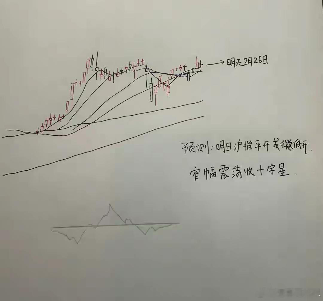 所以综合以上分析,对于明天市场的走势,我个人的观点是,明天上证指数或者还会收出一颗窄幅震荡的十字星的走势。那么明天A股到底怎么走?大家请看,关于明天走势的手绘预测图: