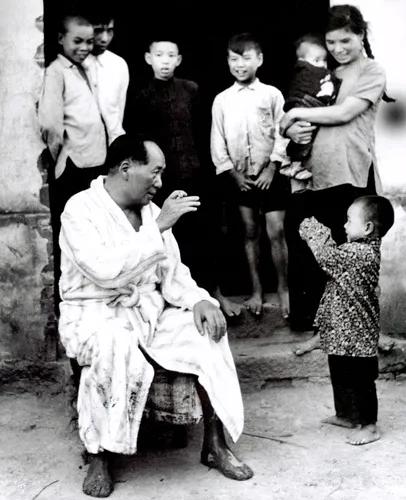 1959年6月,毛泽东回到阔别32年的家乡湖南韶山冲,与当地乡亲们亲切互动的瞬间。 毛泽东坐在农家门口的木凳上,手里拿着香烟,身体微微前倾,眼神温和含笑,满是温情地看着面前的孩童。 面前的幼童光着脚,穿着碎花布衣,举着小手与他互动,眼神里满是天真与亲近,没有丝毫拘谨。 毛泽东身后的农家门廊下,站满了韶山的乡亲们,有抱着婴儿的妇女,有光着脚的少年,他们都面带淳朴的笑容,看着眼前这温馨的一幕,整个场景松弛、温暖,没有丝毫距离感。