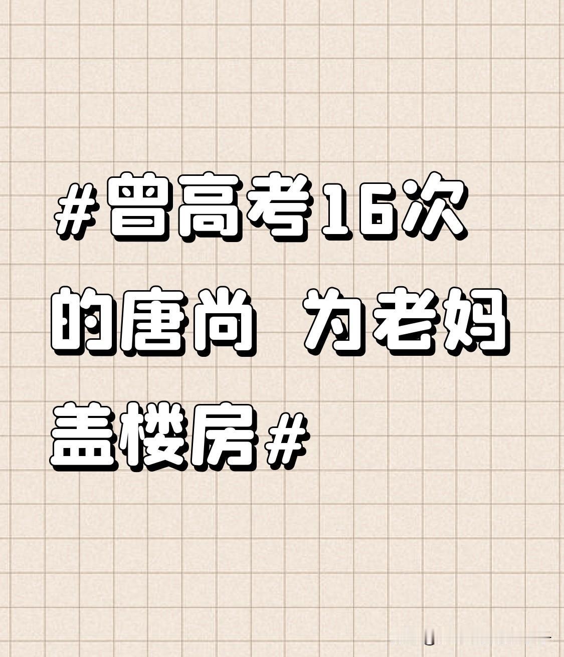 曾高考16次的唐尚珺为老妈盖楼房 唐尚珺,那个曾高考16次的“钉子户”,最近又有新动态了。小山村年味未散时,他和母亲就决定拆了住了30年的老房子盖新房。看着老屋一点点被拆除,这个铁汉哭得像个孩子。他说近10年就哭过三次,这次是为老屋,更是为对母亲和家庭的亏欠。 如今唐尚珺在华南师范大学读大二,学业上高数、C语言吃力,但也努力考出了不错的成绩。为了生计,周末他和校友直播带货。现在攒够钱给78岁的母亲翻新房子,这份担当让人看到了他的成熟。未来他还向往清华,也做好投身教育的准备。希望他能越来越好。