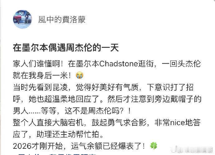 昆凌成周杰伦的防伪标识澳大利亚偶遇周杰伦昆凌 网友分享在墨尔本Chadstone逛街,先看到气质温柔的昆凌,才反应过来旁边戴帽子的就是周杰伦本人,鼓起勇气求合影,助理还主动帮忙拍,网友热评:“昆凌成了周杰伦的防伪标志”。先见昆凌后见杰伦,这波操作太真实了!