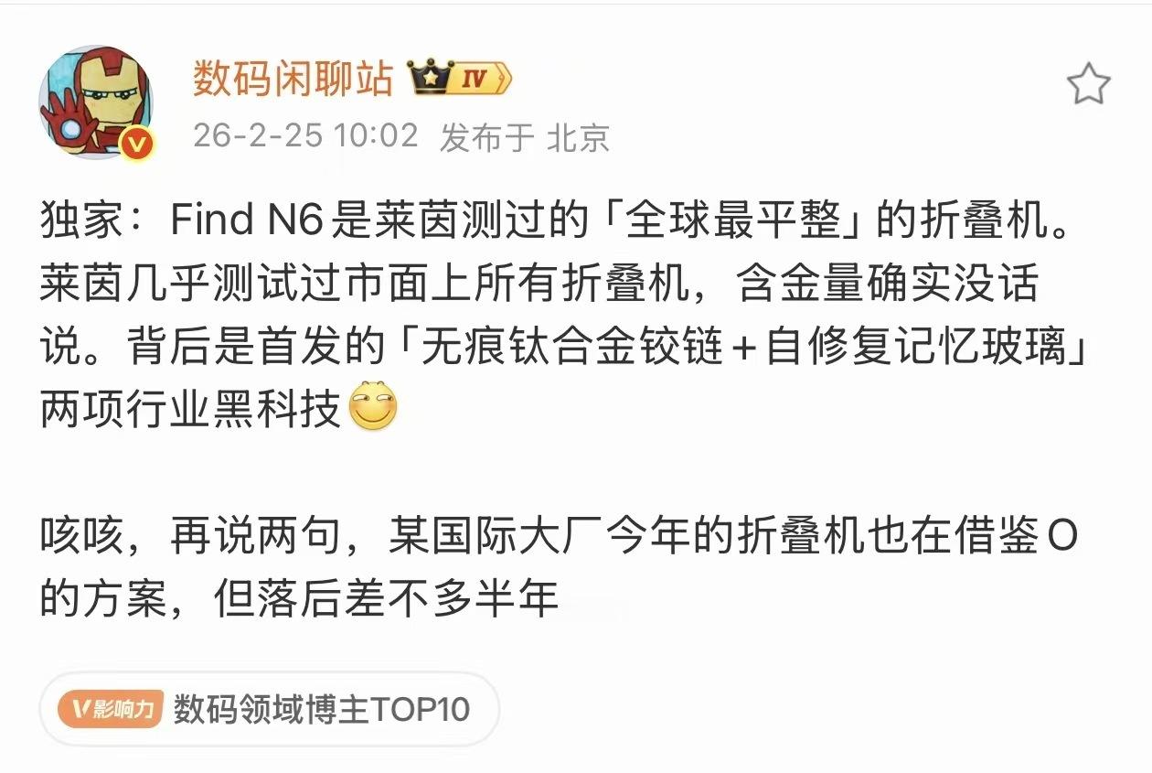 实锤了!这次又是O首发领跑!Find N6拿下莱茵认证「全球最平整折叠机」,无痕钛合金铰链+自修复记忆玻璃双黑科技加持,而且听说,有些国际大厂今年的折叠屏也在学这套方案,但至少晚了半年。一句“一马平川”,直接预定折叠屏新标杆!折叠屏数码资讯