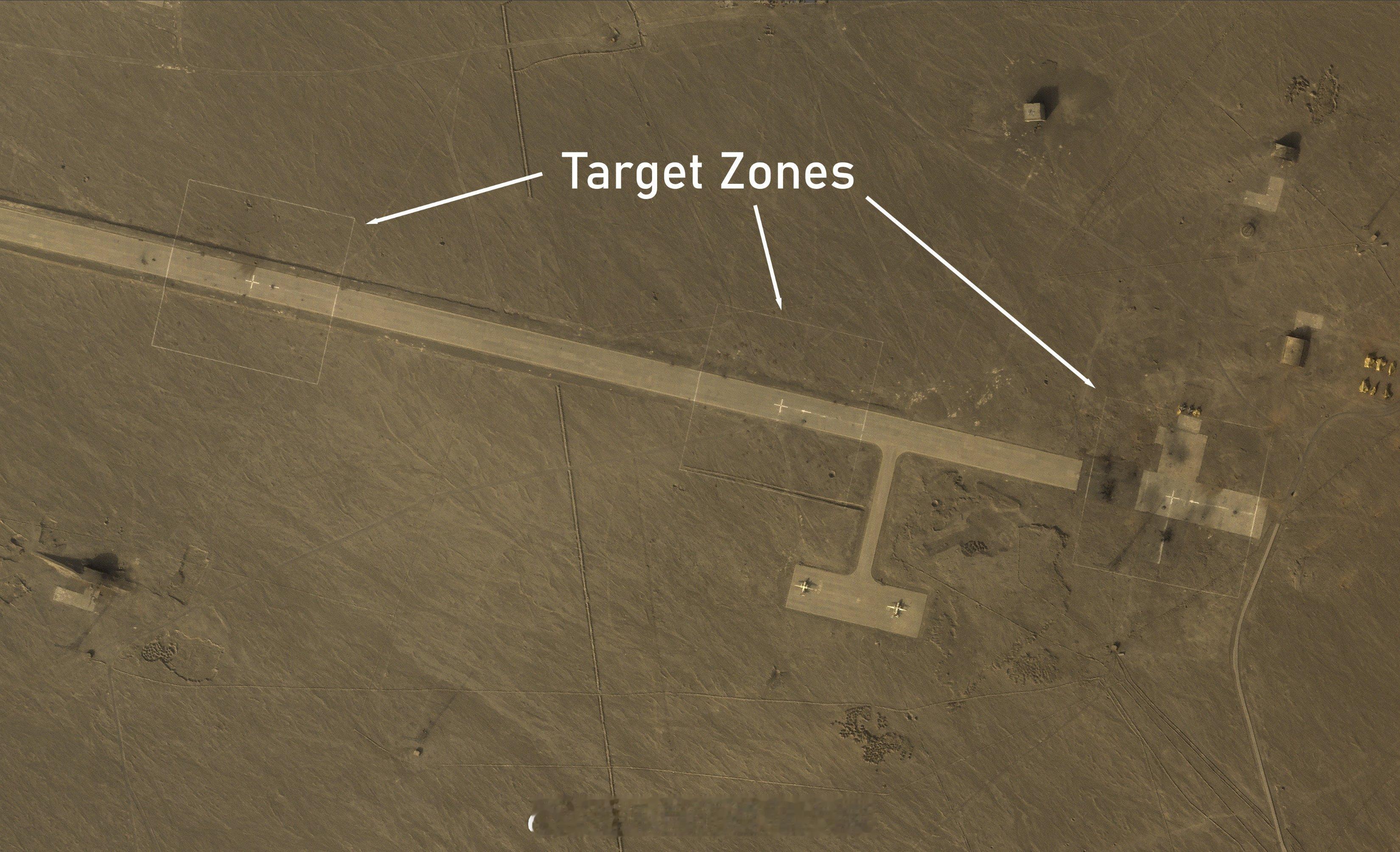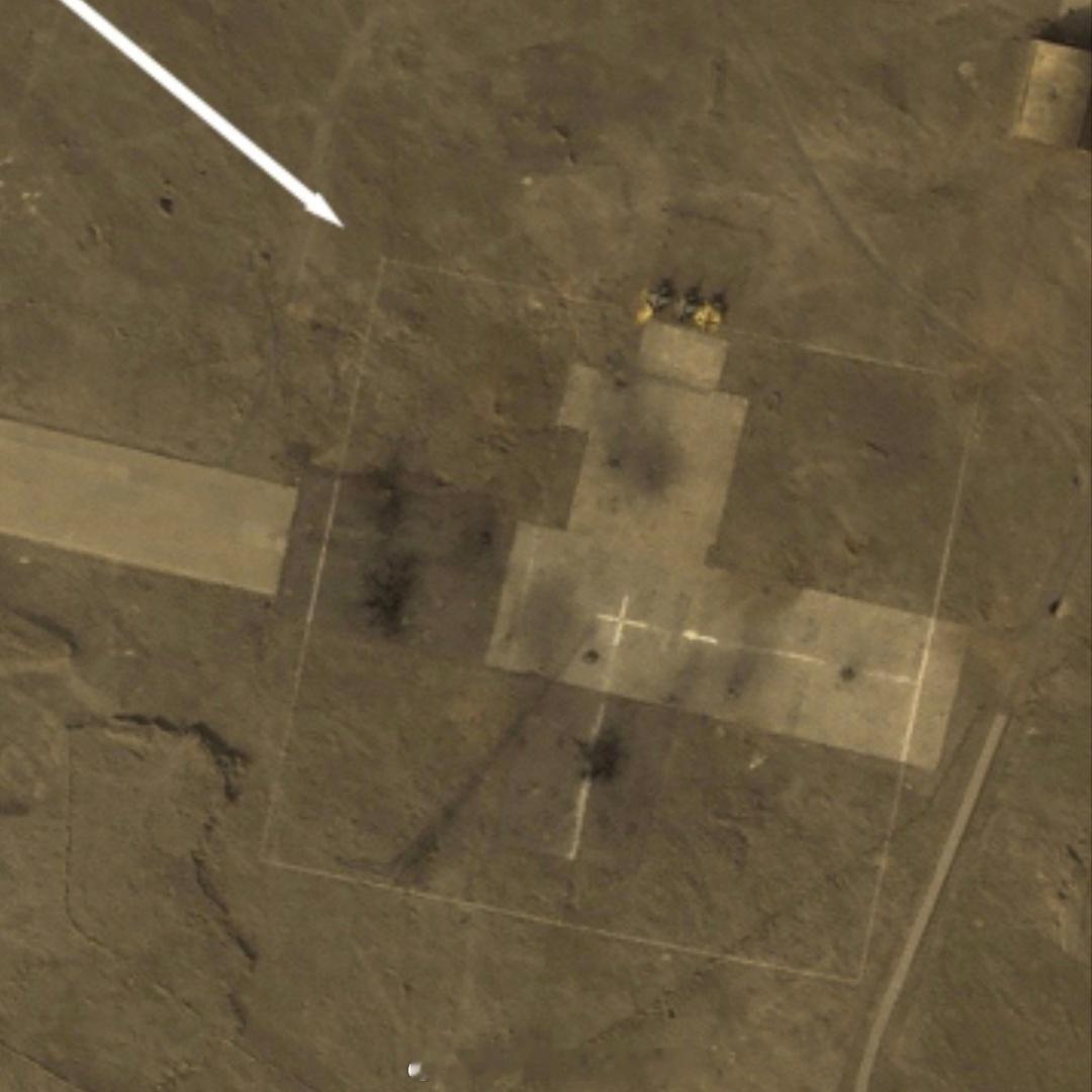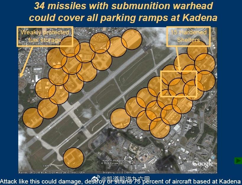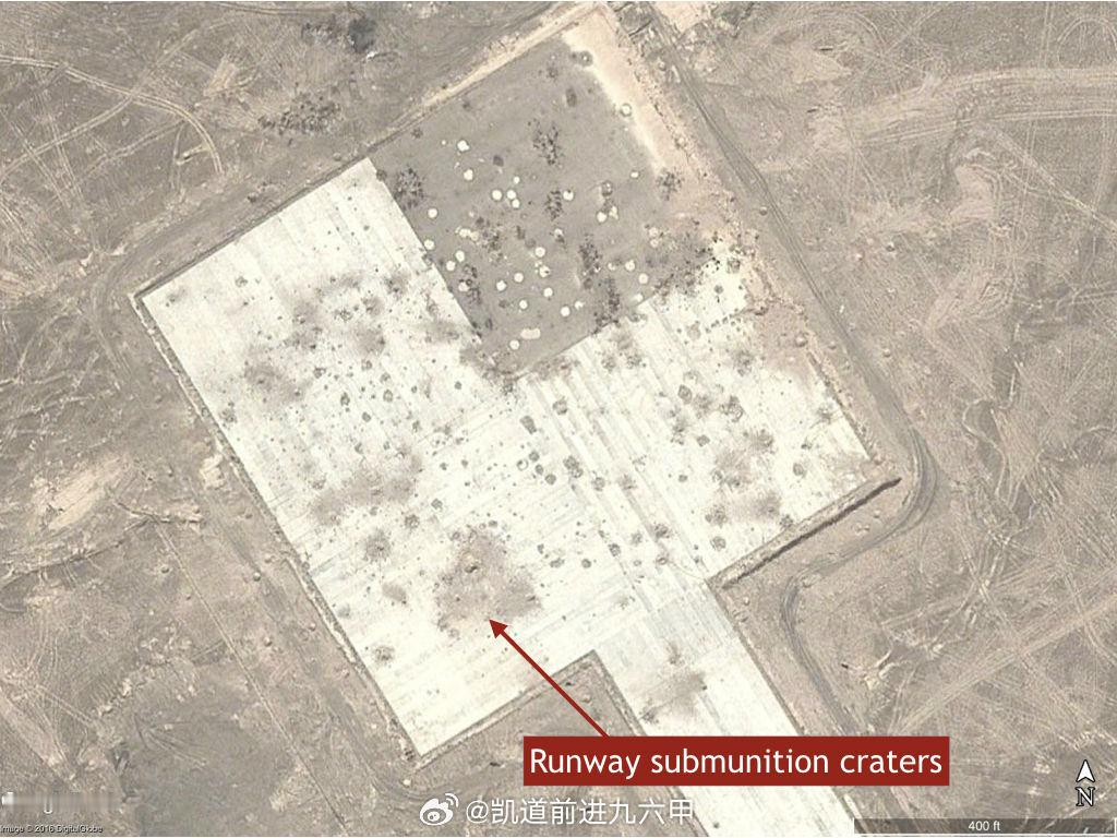 台海局势 西方卫星发现了大西北导弹靶场上,由东风搭载的集束子弹药在模拟跑道和停机坪上留下的痕迹。该机场靶的三个指定弹着区均有痕迹。