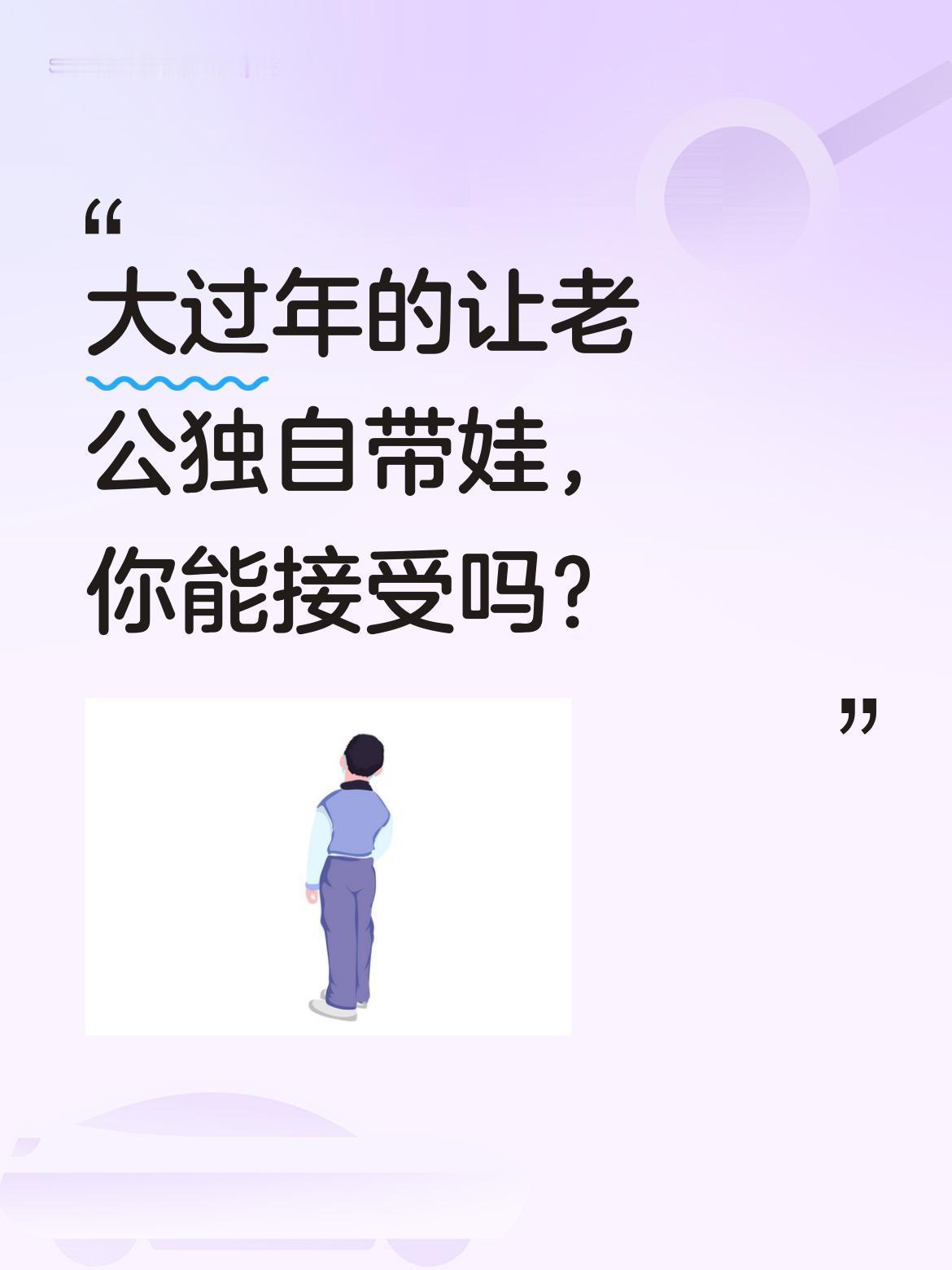 大过年的让老公独自带娃,你能接受吗? 有妈妈说:"一个优秀的妈妈永远不会眼睁睁看着老公一个人带娃,更何况还大过年的"。其实现在越来越多家庭讲究育儿分工,爸爸带娃也成了常态。不过传统观念里,妈妈似乎总被赋予更多育儿责任。你们家过年带娃是怎么分工的?