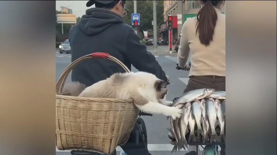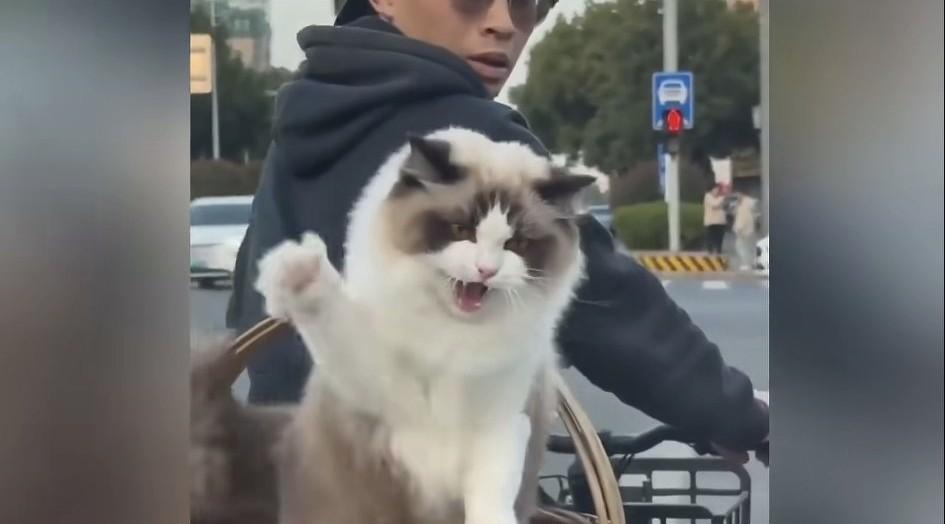 在一个红绿灯路口,一只小猫咪看到旁边后座上的鱼,兴奋的去勾,没想到被后面的喇叭声给惊了。 最后恼羞成怒的猫猫冲着后面的人举着猫猫拳威胁!
