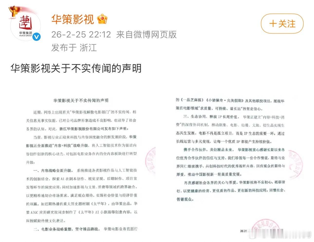 华策声明 现在手头也还有一些主控和参投的电影项目,电影业务部门没有解散,人员变动、架构调整都是因为在做战略升级。