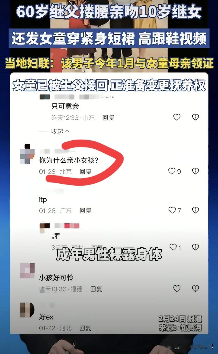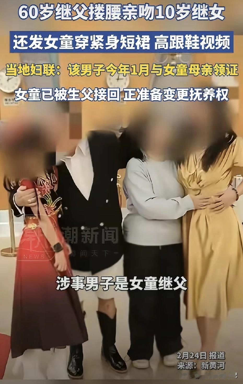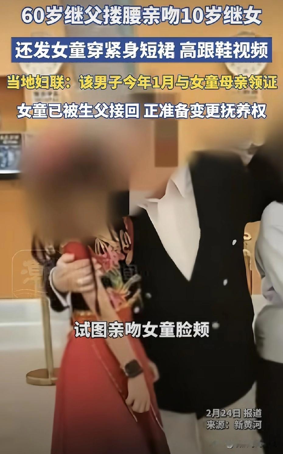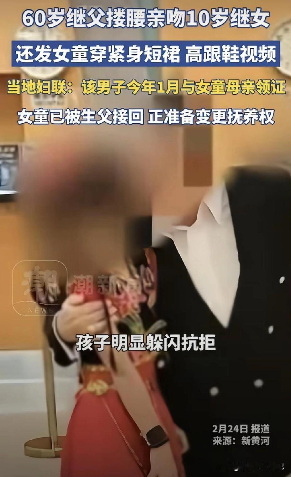 "拍着玩的"这四个字,是2026年最烂的遮羞布。10岁女孩,被六旬继父搂腰试图亲吻,身体拼命后仰、躲闪、抗拒。亲妈站在镜头后,笑着说:"我们一家人拍着玩的。" 拍着玩?玩什么?玩孩子的身体边界感?玩公众的道德底线?还是玩"只要我不尴尬,尴尬的就是全世界"? 当全网愤怒时,有人轻飘飘一句"孩子在学校挺正常的"。原来"正常"的标尺,是老师眼里的乖巧,而不是孩子夜里会不会做噩梦。 还有那个玻璃罐倒影,别问,问就是"光线问题";别查,查就是"家庭隐私"。 我们总在讨论"女大避父",却忘了问:是谁把高跟鞋和紧身裙穿在10岁孩子身上?是谁把"继父"这个身份,当成了触碰的许可证? 孩子自己拨通了亲生父亲的电话。一个10岁的孩子,在春节的团圆里,选择向远方求救。这不是"小矛盾",这是求生本能。 账号被封了,视频下架了,热搜过去了。但那个躲闪的背影,那个后仰的脖颈,那个在玻璃罐倒影里可能存在的秘密,它们不会过去。 边界感不是奢侈品,是孩子的安全带。 当母亲说"没事"的时候,请听听孩子的身体在说什么。 保护未成年人,不能只靠"发现得早",更要靠"管得严、罚得重、边界清"。 这件事给我们敲响了警钟,家庭重组不是原罪,但"边界模糊"是。社会需要建立更明确的"继亲关系行为准则",学校、社区、妇联必须形成联动机制,把"儿童身体自主权"教育纳入必修课。 最重要的是当孩子说"不"的时候,全世界都该听见! (图源:新黄河,法治进行时)