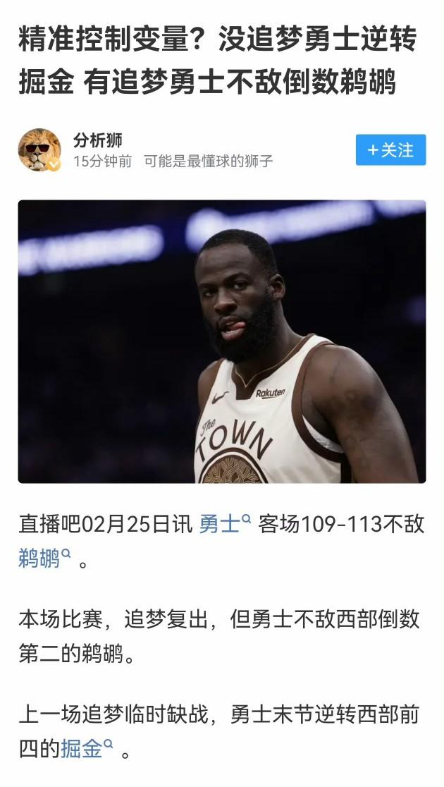 勇士要是没有追梦就好了……想不通科尔一直留着他干嘛? 勇士109-113不敌西部垫底的鹈鹕,要是有库明加就好了。 时间往前两天,勇士残阵8人轮换2300万总年薪,128-117击败西部第三的掘金,掘金可是完整阵容。