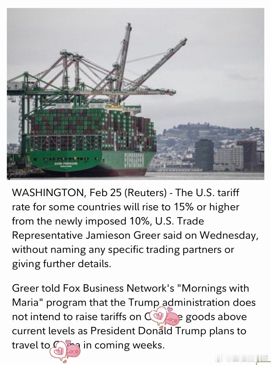 美国贸易代表:新关税是+10%,有些国家会涨到+15%,或更高…对某国近期不会涨,因为总统马上要去