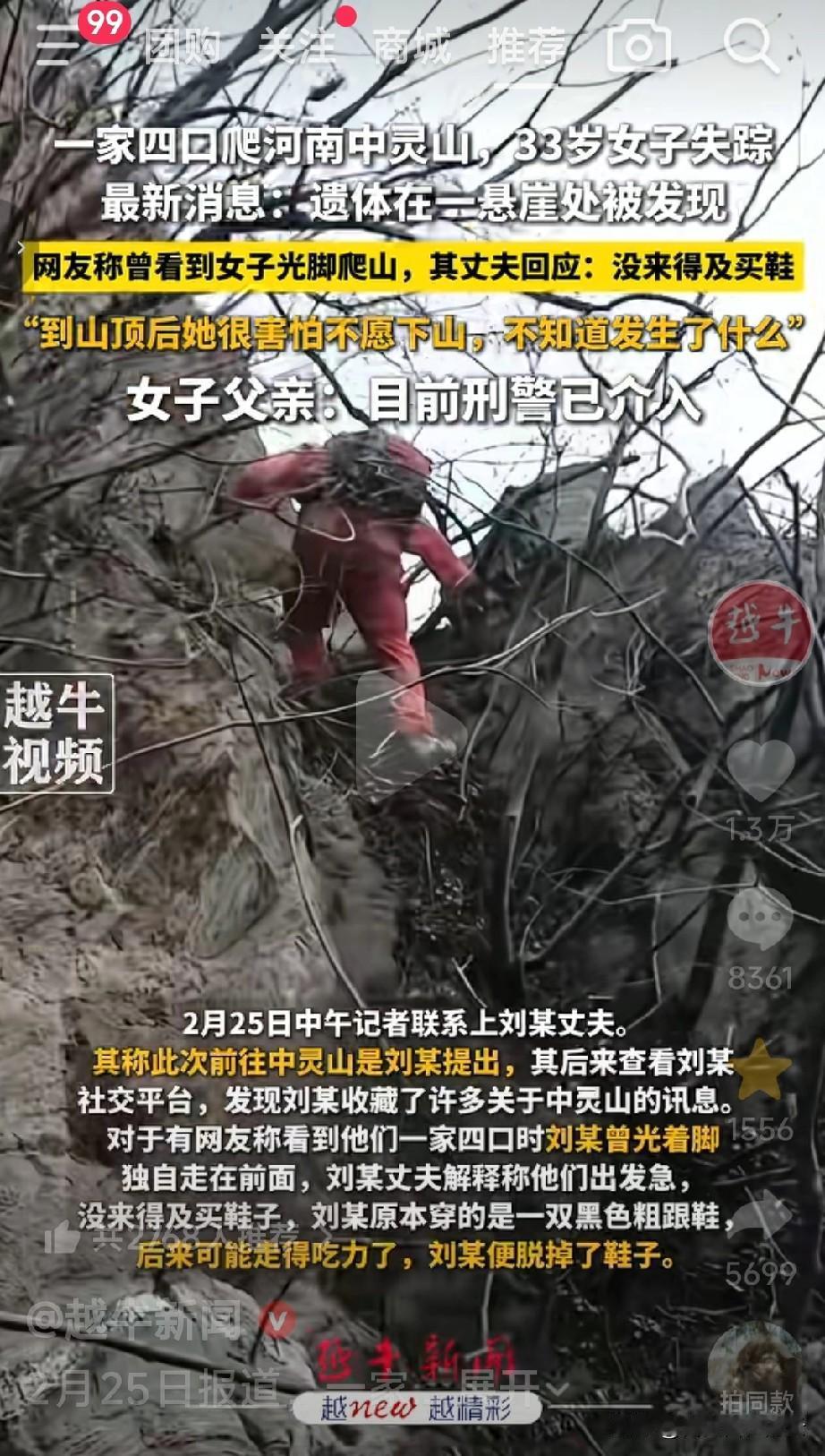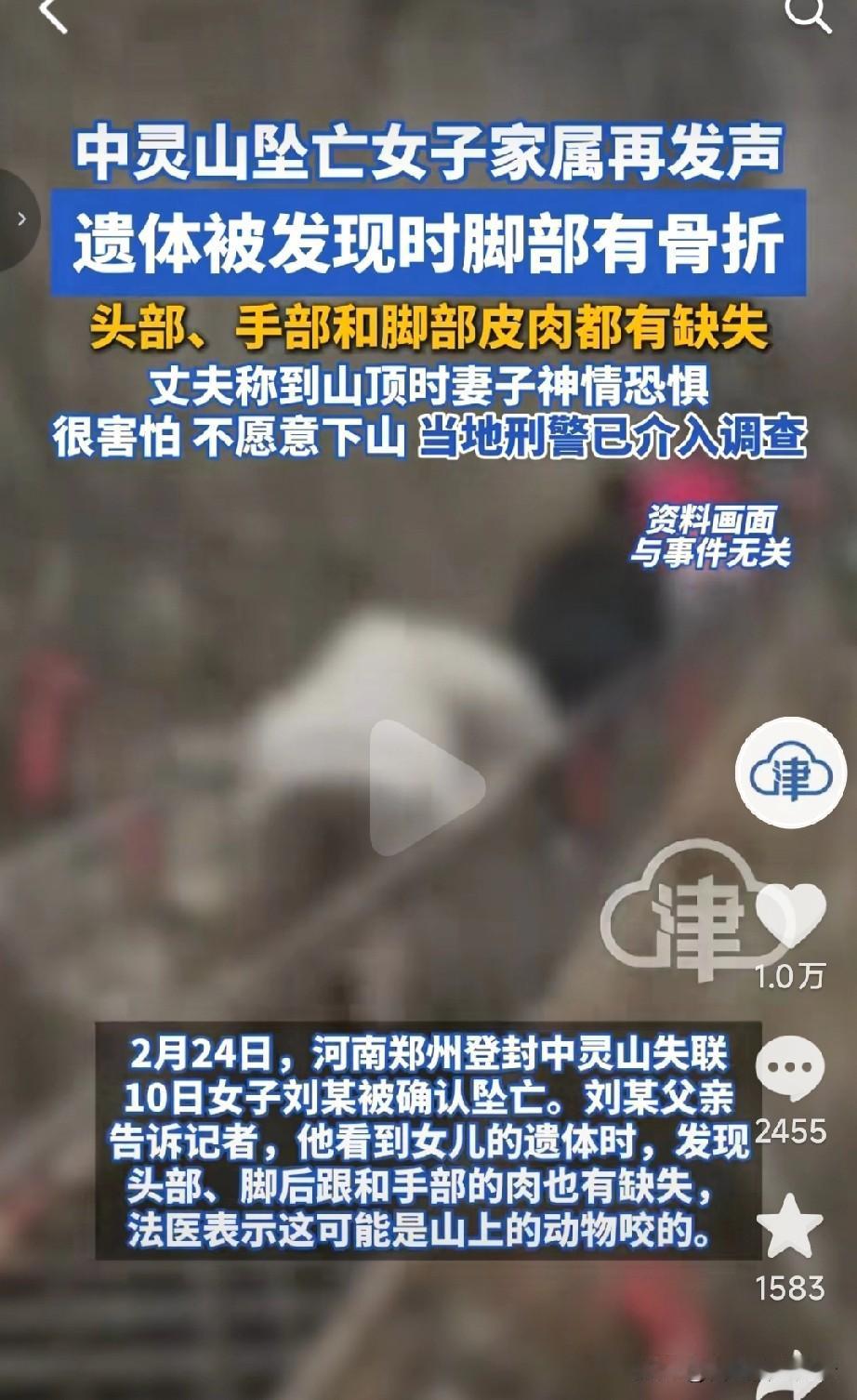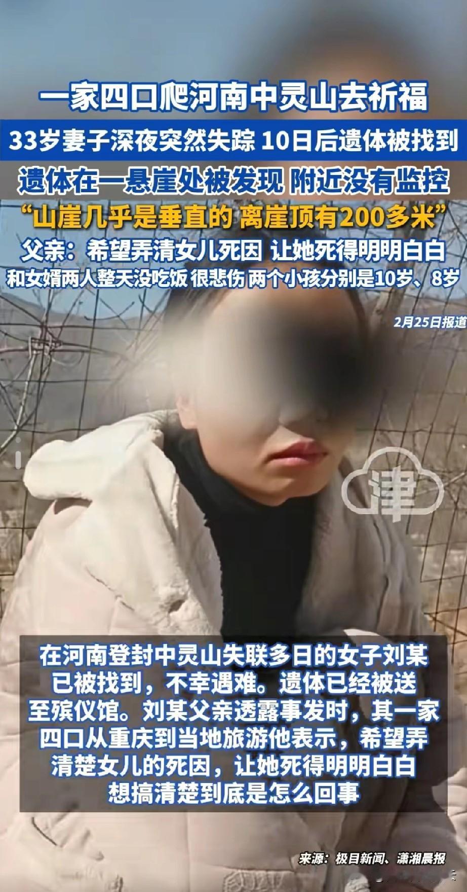 在中灵山失踪十天的女子找到了,可惜已经坠崖死亡,女子的父亲说,女子身体的肉有缺失,可能遭遇动物的咬食,真是太可怜了。 女子才33岁,有两个孩子,一儿一女。一个10岁,一个8岁。女子丈夫说他们这次从重庆大老远来,是来祈福的,到这里来是妻子提出的。中灵山的相关信息被她放在收藏夹里收藏了很久。 说实话这就有点奇怪了,一个一直想来中灵山的人,肯定爬山时做了攻略,即使没做攻略,也不能穿睡裤,高跟鞋过来爬山啊。后来丈夫说因为妻子嫌累,干脆光脚爬山。丈夫还拉着行李箱,这一家人,怎么也不像过来爬山的。 当地民宿老板说,即使走走停停,三四个小时也能上山。这说明这个山不太高,可是女子光脚上山,丈夫还晚她一个小时上山,我觉得有点不合情理。 现在女子父亲说,刑警已经介入调查,希望早日能查明真相,让女子死的明明白白。也希望逝者安息。 [祈祷][祈祷][祈祷][祈祷][祈祷][祈祷][祈祷][祈祷][祈祷]