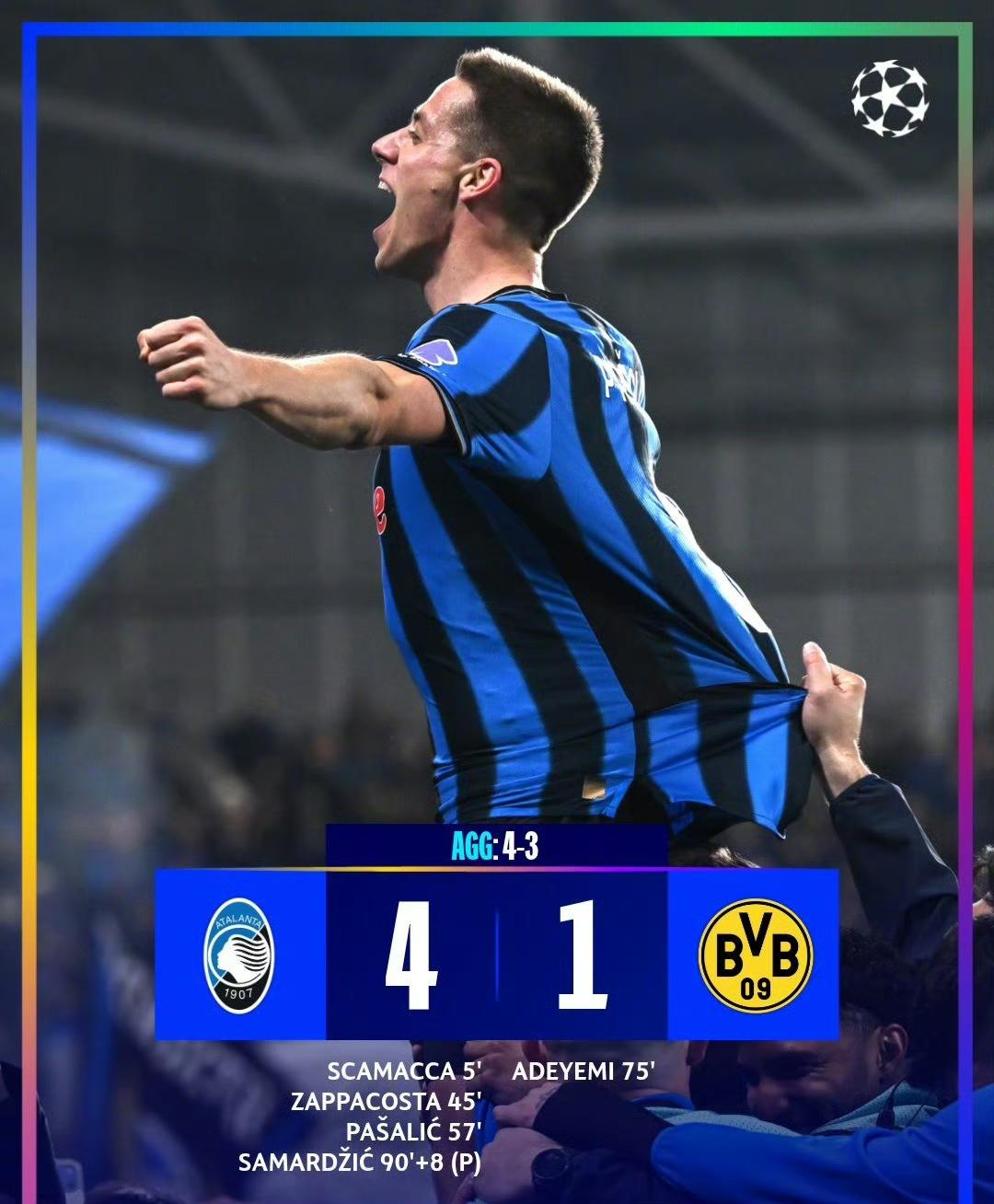 欧冠神剧情! 从0-2到4-3,第98分钟点球绝杀! 意甲劲旅绝地翻盘,逆转闯进16强! 北京时间2月26日,欧冠淘汰赛附加赛次回合,亚特兰大对阵多特蒙德。 首回合的节奏基本处于多特掌控范围,吉拉西和拜尔相继建功,2-0抢占先机。 亚特兰大次回合没有退路,坐镇主场队伍是充满斗志,开局仅用五分钟通过边中结合制造对手禁区解围失误,斯卡马卡近距离抓住机会轻松打进,闪击破门振奋士气,这无疑是让他们看到希望的曙光。 两队随后是较长时间的僵持,眼看上半场即将结束,没想到亚特兰大又拼出机会,扎帕科斯塔的一脚高质量远射击中防守球员变线入网,积极的态度也是得到运气的眷顾。一来一回,大黄蜂的优势荡然无存,进攻碌碌无为,防线还漏洞百出,全员表现太差劲。 回到下半场的角逐,亚特兰大是愈战愈勇,德容恩第57分钟大范围精准传中,助攻帕萨利奇头球抢点顶进,总比分从0-2到3-2,一鼓作气实现反超,他们强势扭转颓势。 大黄蜂陷入逆境,主教练连续换人变阵,阿德耶米扮演替补奇兵,第75分钟挺身而出内切打进,这才得以帮助队伍稳定军心。 双方又是一段时间缠斗,补时尾声阶段意想不到的剧情发生,科贝尔出球直接失误被断,本塞拜尼禁区解围犯规送点,萨马尔季奇第98分钟点球稳稳打进,最终亚特兰大次回合4-1大胜,总比分4-3绝杀,一场酣畅淋漓的绝地翻盘,昂首挺进16强。