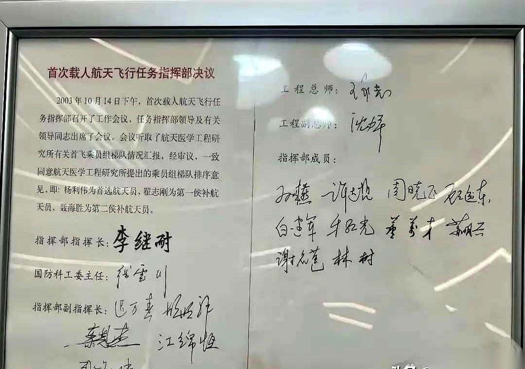 杨利伟、翟志刚、聂海胜。 三个名字,一份名单,落款时间:神舟五号发射前一天。 我看到这份文件的时候,真的有点头皮发麻。 这不是什么策划案,也不是什么流程表。这是在人类即将踏入太空前的最后24小时,签下的一份“军令状”。 首选,第一候补,第二候补。 排序清清楚楚,白纸黑字。 你可以想象那个会议室里的空气有多凝重。外面是蓄势待发的火箭,全世界的目光都盯着。而屋里,一群大佬,在为一个民族的千年梦想,做最后的人选确认。 那串签名,李继耐、张庆伟、栾恩杰……随便拎出一个,都是中国航天史上响当当的名字。我猜他们落笔的时候,手心都攥着一把汗。 签下的哪是名字啊。 是责任。 是把整个国家、几代航天人的心血,稳稳地交到杨利伟的手上。 也是在告诉另外两位英雄:你们的准备,你们的付出,同样是这枚军功章的一部分。随时准备着,为了万无一失。 我们总看到火箭升空那一刻的辉煌,但很少有人知道,辉煌背后,是这样一个个具体到人、具体到秒、容不得半点侥幸的瞬间。 这才是真正的底气。 这才是我们能把人稳稳当当送上天,又能平平安安接回家的原因。