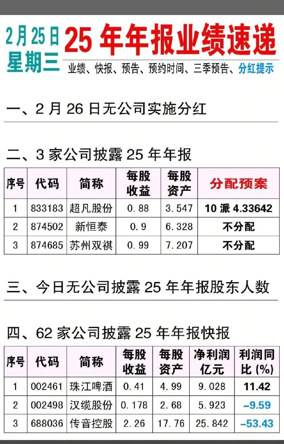 2月26日,周四A股年报速递!!! 3家公司披露25年年报;62家公司披露25