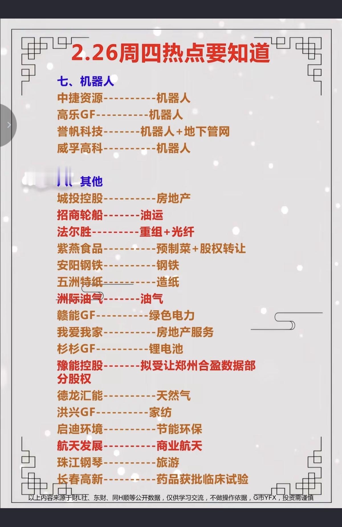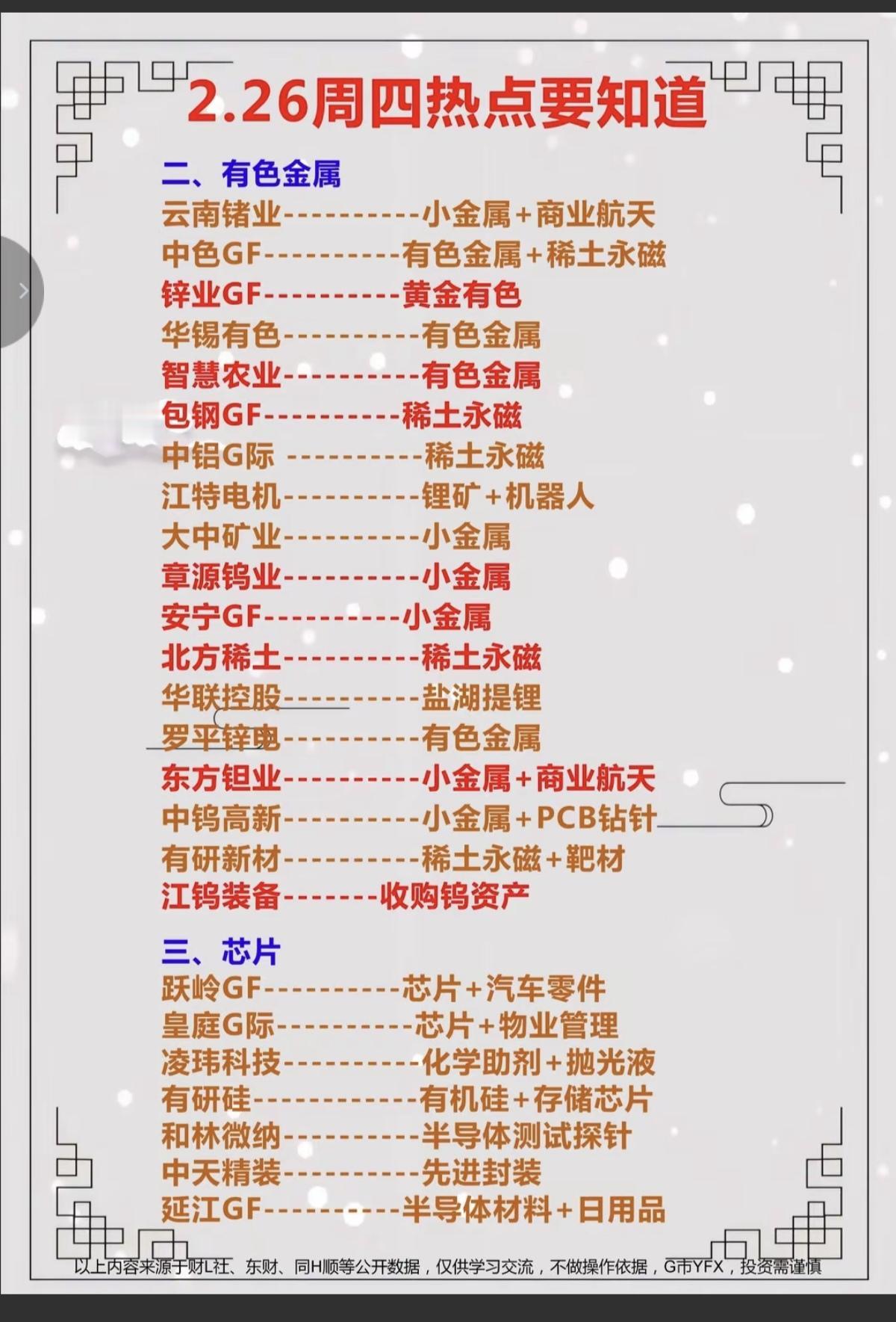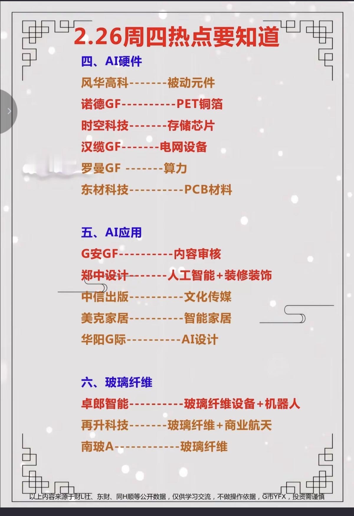 2.26周四 市场热点方向+投资逻辑! 1.化工原料,近期热点 2.有色金属,小金属,锂矿 3.存储芯片 4.人工智能AI硬件、AI应用 5.机器人 6.玻璃玻纤 相关核心龙头股: