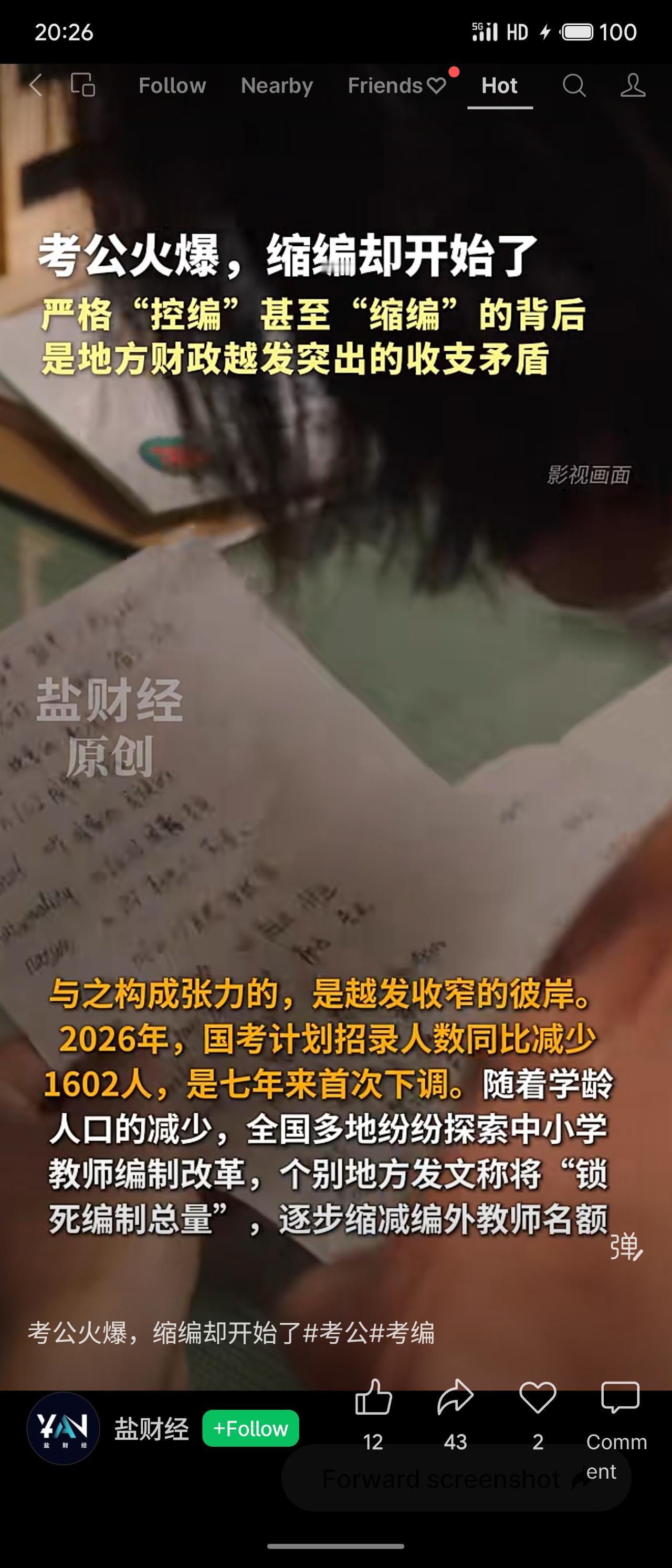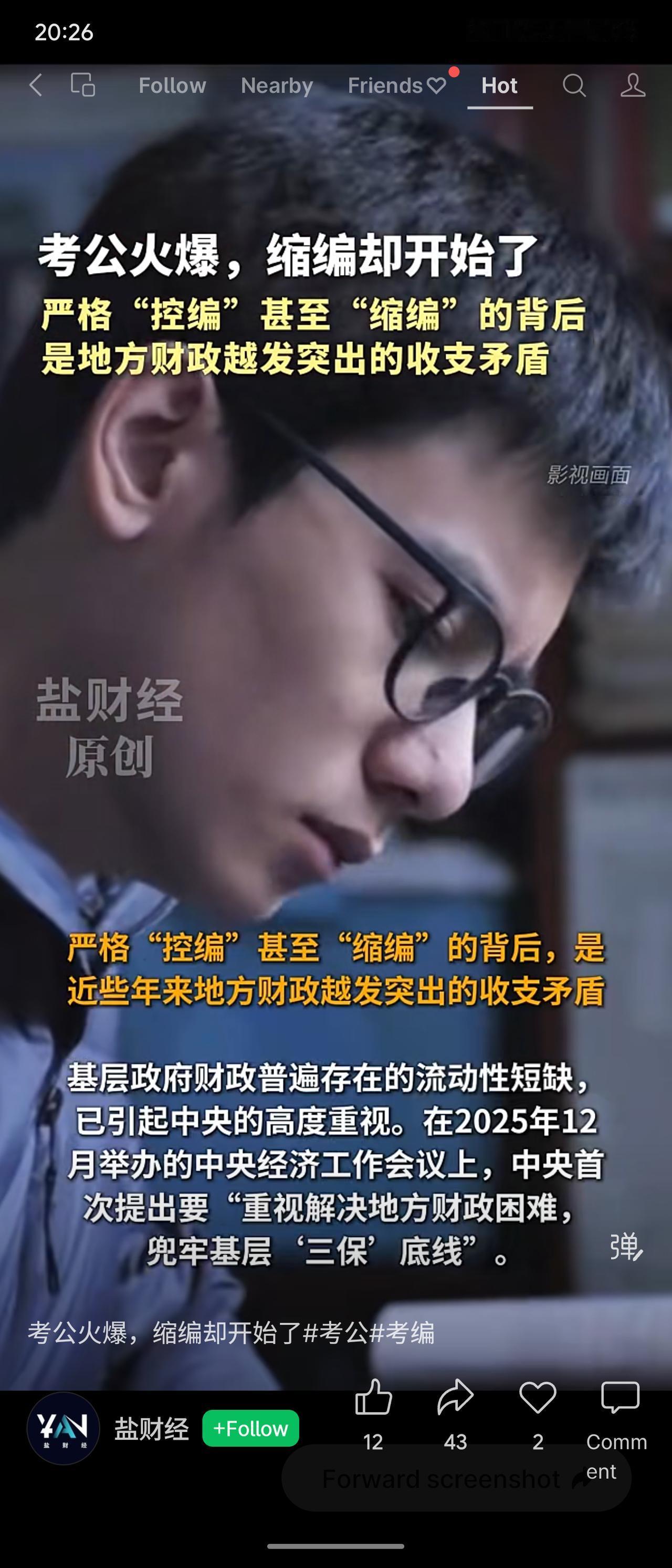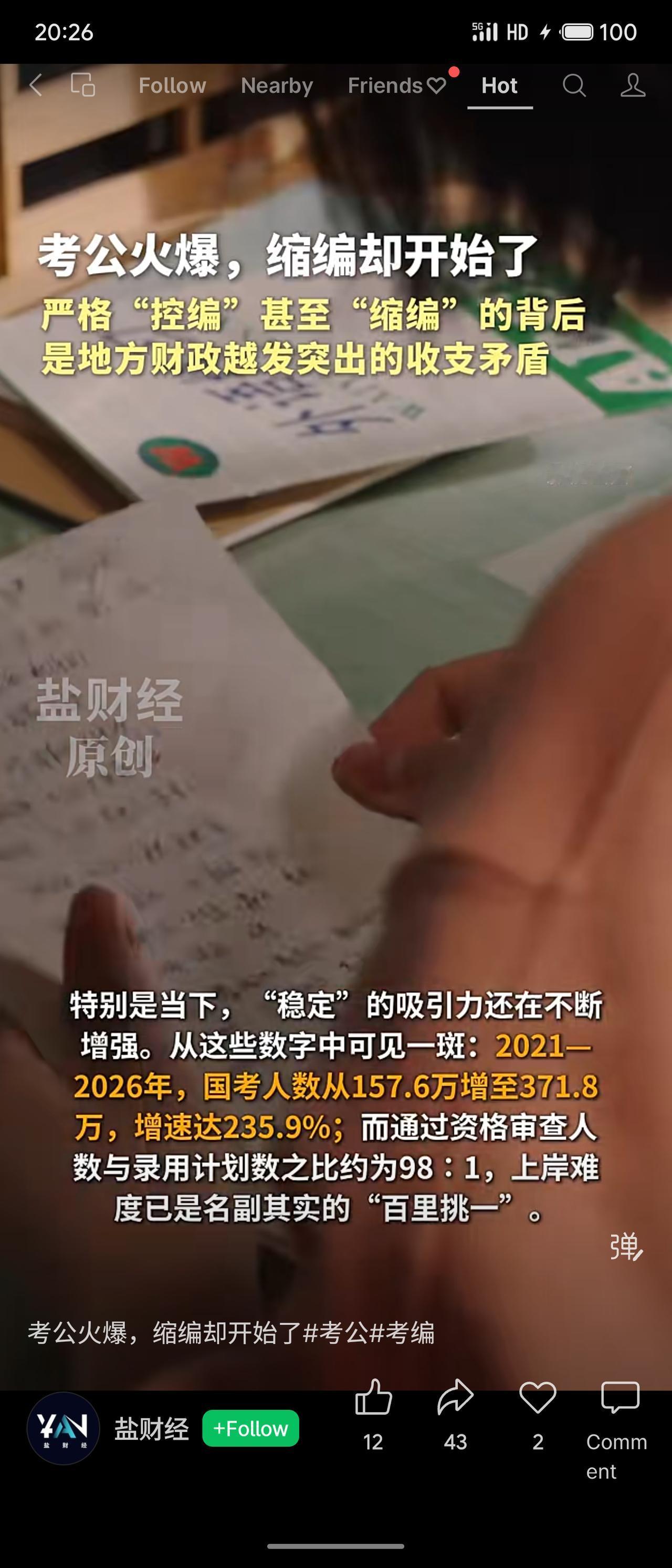 考公人数五年暴涨235.9%,2026年国考竞争比高达98:1。但同期国考招录七年来首次缩减,多地严控甚至压缩编制。背后是地方财政吃紧,土地收入下滑而“三保”支出压力不减,专家称未来人员调整或将加速。