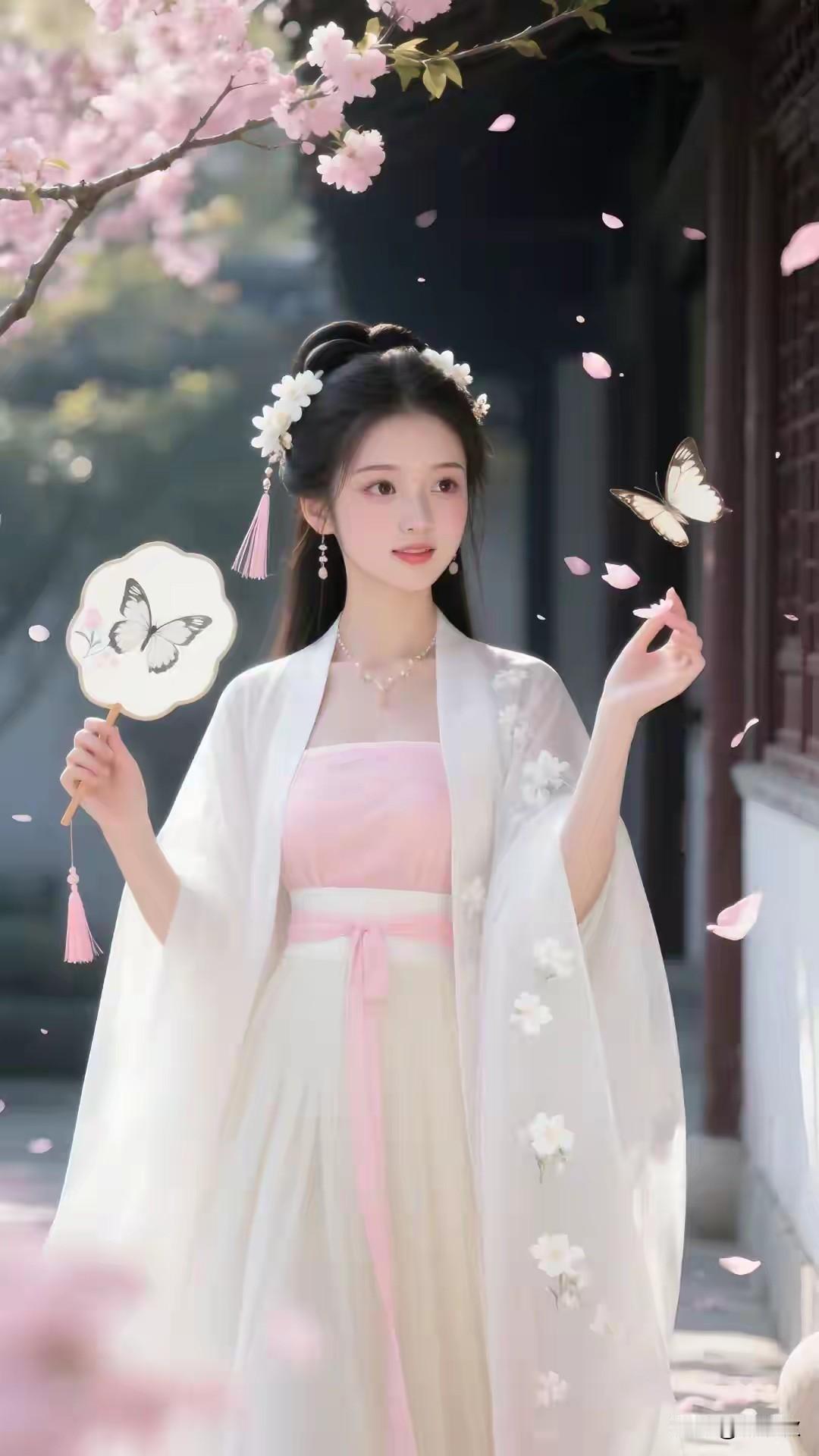 清水出芙蓉,天然去雕饰。 粉白汉服,尽显温柔。 眉清目秀,美若冠玉。 冰肌玉虎,明眸皓齿。 窈窕淑女,君子好逑。 国色天香,国色天香。 千种风情,万般妩媚。