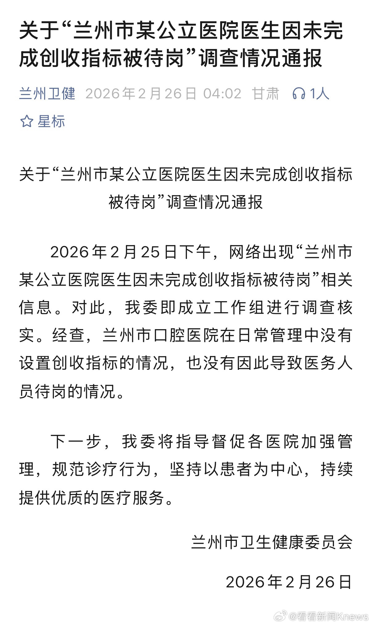 【#兰州通报医生未完成创收被待岗#】#兰州公立医院未设置创收指标#2月26日,兰州市卫生健康委员会发布情况通报:2026年2月25日下午,网络出现“兰州市某公立医院医生因未完成创收指标被待岗”相关信息。对此,我委即成立工作组进行调查核实。经查,兰州市口腔医院在日常管理中没有设置创收指标的情况,也没有因此导致医务人员待岗的情况。下一步,我委将指导督促各医院加强管理,规范诊疗行为,坚持以患者为中心,持续提供优质的医疗服务。