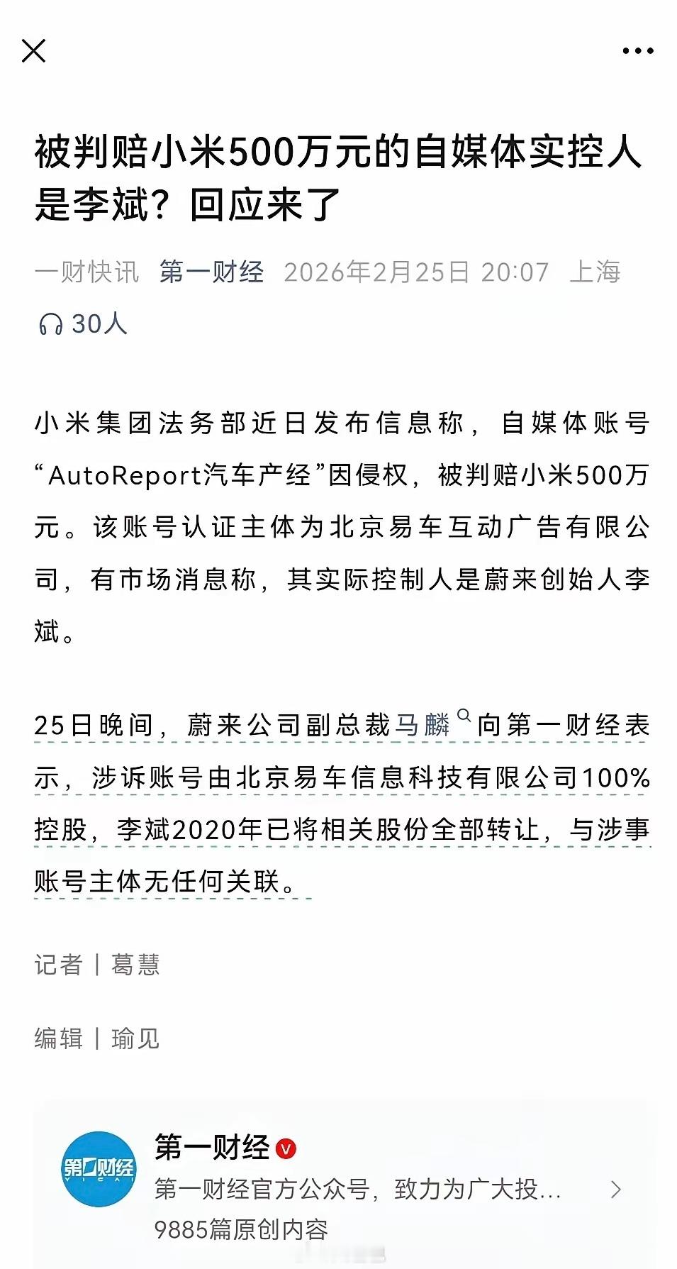 行业里面的人基本都知道2018年李斌已卸任易车CEO,专注蔚来;2020年易车私有化退市并入腾讯,李斌出售全部股份退出。 小米起诉自媒体获赔500万